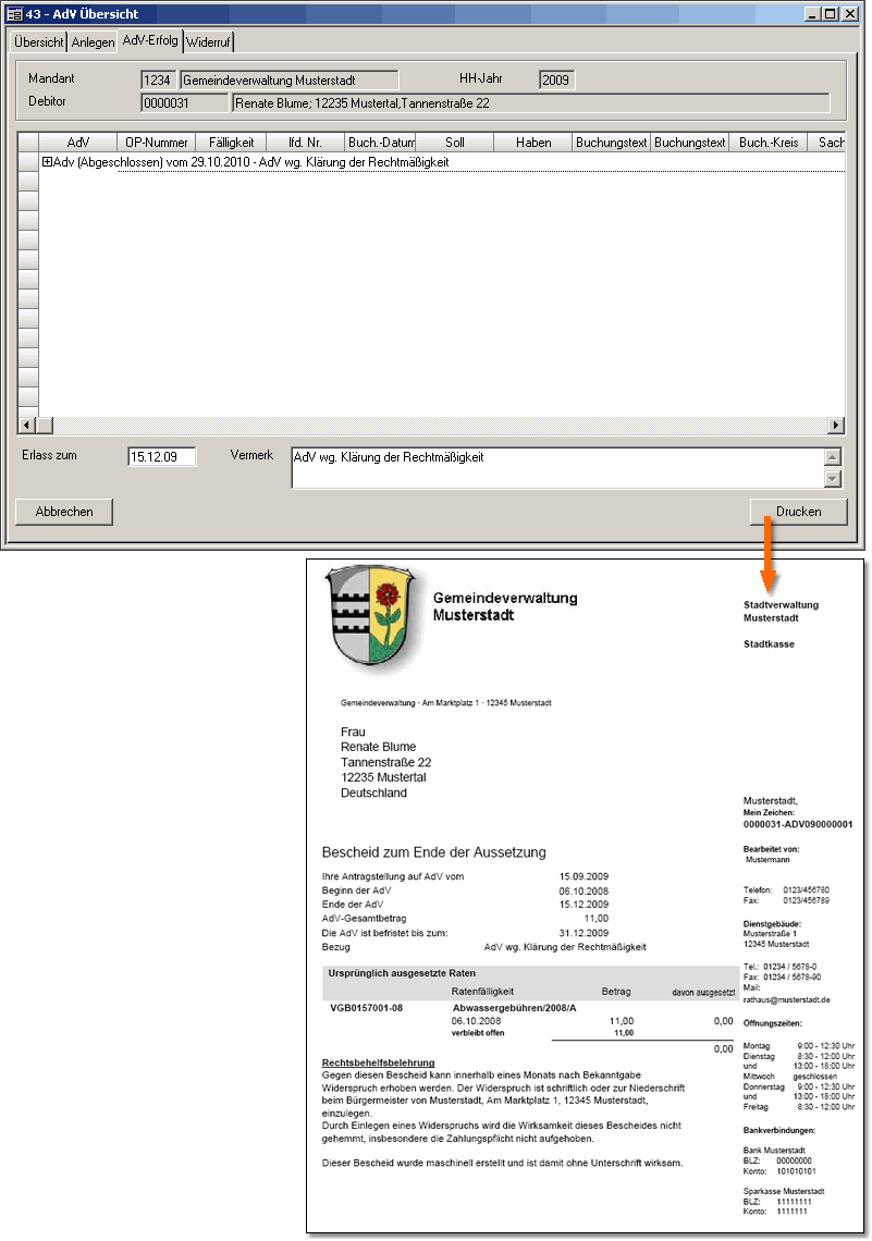 Mit der anschließenden Betätigung des Button „Drucken“ wird ein Bescheid zur Beendigung der AdV erstellt, gleichzeitig wird die Sperre am offenen Posten aufgehoben.