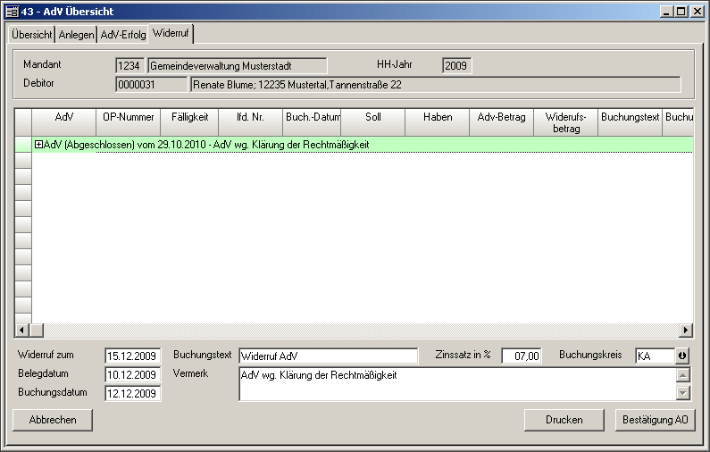 Abbrechen Rückkehr in das letzte aktive Dialogfenster Drucken Es wird der Widerrufsbescheid gedruckt Bestätigung AO Der OP wird wieder hergestellt, die AdV wird beendet und berechnete Zinsen werden ins Soll gestellt
