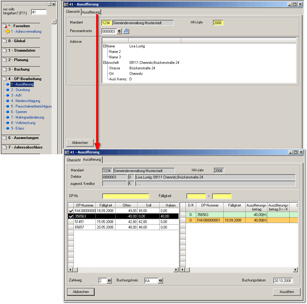 Bei Aufruf der Funktion werden zunächst nach Auswahl der Adresse die in den Stammdaten des Personenkontos hinterlegten Eingaben wie Name, Adresse und Bankverbindung angezeigt. Über die Registerkarte „Auszifferung“ wird anschließend eine Aufstellung offener Posten und Überzahlpositionen für das Personenkonto geöffnet und kann durch die Selektionsfelder „OP-Nr.“ und „Fälligkeit“ gegebenenfalls weiter gefiltert werden. Durch Doppelklick links auf die Zeilenköpfe der einzelnen offenen Posten und Überzahlungen werden diese in das rechte Fenster übernommen und dort sofort gegeneinander aufgerechnet. Unterschiedsbeträge bei der Aufrechnung bleiben danach als Rest-OP oder Restguthaben auf dem Personenkonto erhalten. Bei Fehlübernahmen einzelner Positionen wird mit einem Doppelklick auf den Zeilenkopf des Einzelsatzes dieser mit einem „ X “ gekennzeichnet und durch „Aktualisieren“ aus der Aufstellung gelöscht. Durch Betätigung des Buttons „Ausziffern“ wird die gegenseitige Ausbuchung der Positionen über den gewählten Umbuchungs- bzw. Auszifferungszahlweg vorgenommen und in den Buchungsstapel übertragen.