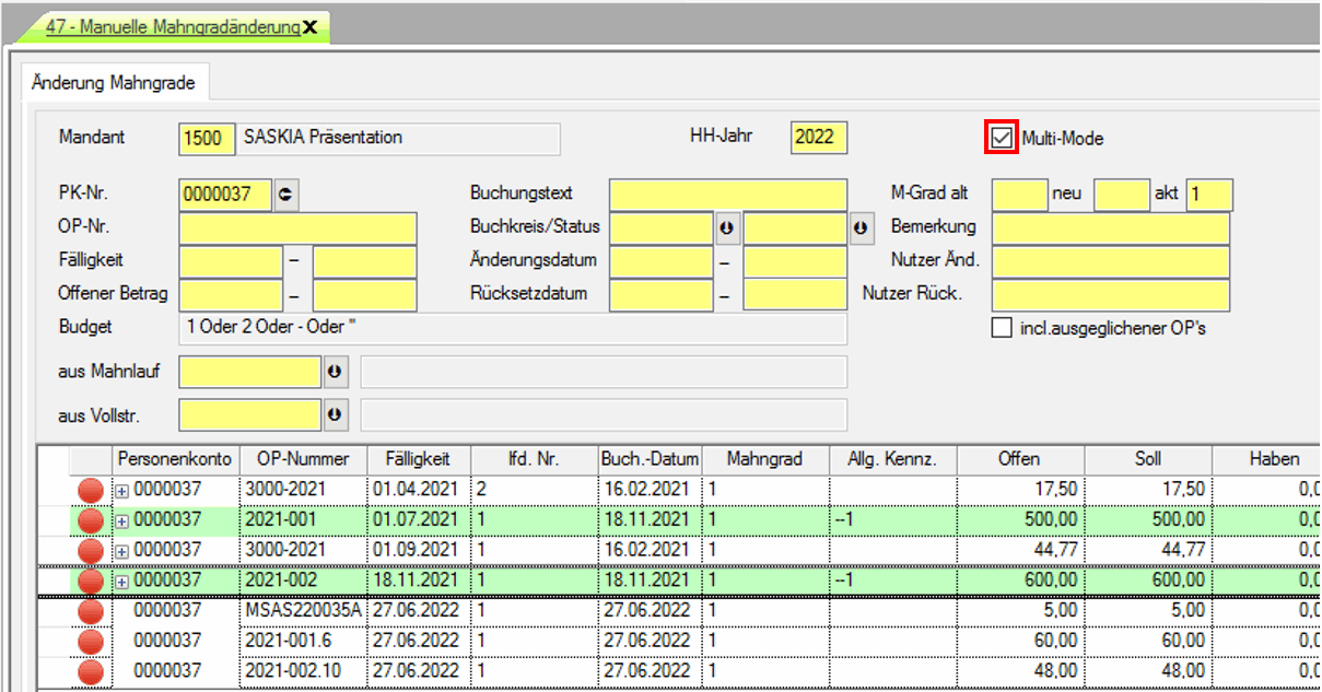 Da es sich um gleichartige zu bearbeitende OP’s handelt, braucht somit z.B. nur noch einmal ein neuer Mahngrad oder auch das AVVISO-Kennzeichen zurückgesetzt werden. Es muss auch nur einmal eine Bemerkung eingetragen werden.