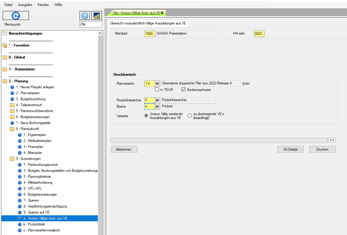 Was liefert die Auswertung voraussichtlich fällige Auszahlungen aus VE ? | |Wo ist die Funktion zu finden ? | | | --- | --- | --- | | |Schnellaufruf in der Suche: | 29a | Die Auswertung wird im Planungsmodul unter „Auswertungen“ und „Voraus. fällige Ausz. aus VE“ ausgegeben. Was ist zu tun ? Diese Liste erstellt eine Übersicht der pro Abrechnungsjahr erstellten Verpflichtungsermächtigungen mit den Eingaben zur geplanten Höhe und der Jahre ihrer geplanten Inanspruchnahme. Wird mit der Auftragsverwaltung gearbeitet, in dem die Reservierungen vorgenommen werden, erscheinen neben den Zahlen der Verpflichtungsermächtigungen auch die durch Auftragsreservierungen eingetragenen Vormerkungen. Neben der Standard VE-Liste wurden neue Auswertungslisten für Verpflichtungsermächtigung integriert. Diese sind feingliedriger nach Teilhaushalt, Produkt, Maßnahme und Sachkonten gegliedert und bieten eine transparentere und nachvollziehbarere Auswertungsmöglichkeit. Zu der Standard- VE Liste, sind folgende Listen hinzugekommen und können über die Variante entsprechend gewählt und dann über den Button "VE-Details" gedruckt werden. 1) Übersicht, aus VE vorauss. fällig werdende Auszahlungen - Inhalt wie auch die Standard VE-Liste nur detaillierter - die Spalte "Haushaltsjahr (Planjahr) weist die Gesamtsumme aller geplanten VE-Werte für die Folgejahr aus (je Bst.) 2) Übersicht, über die zu übertragenden VE's - dies sind VE-Werte, für welche über die Auftragsverwaltung (51) im entsprechenden HH-Jahr bereits Aufträge aus VE für Folgejahre erfasst und bestätigt worden sind. Maske alle Bundesländer außer Sachsen-Anhalt