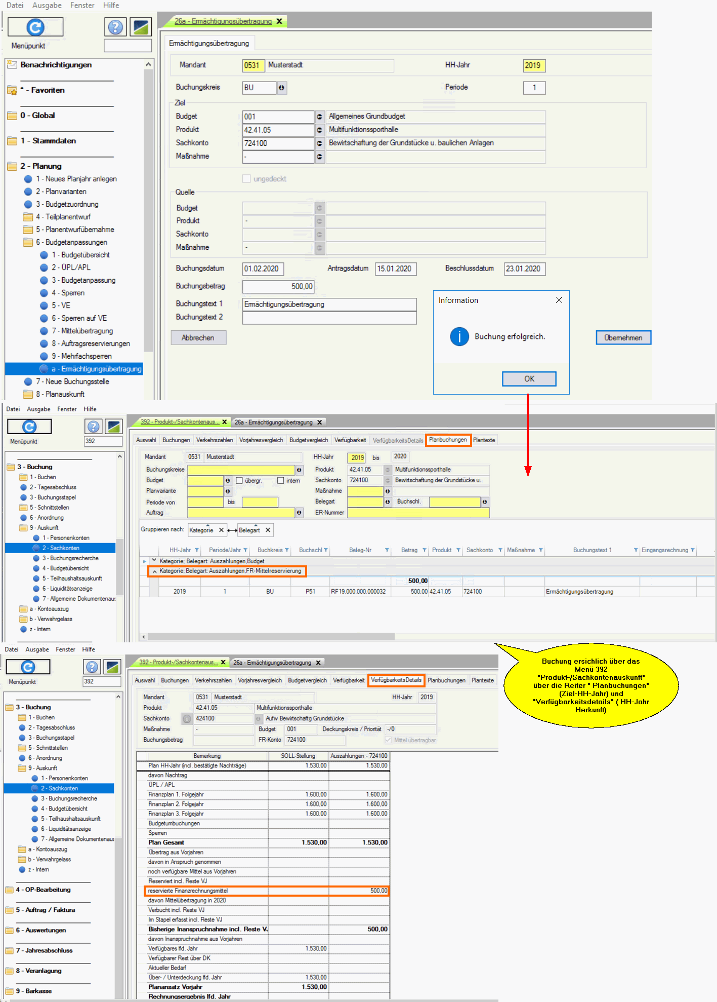 Die Reservierungsbuchung erfolgt anschließend im HH-Jahr sowie des Folgejahres in den Planbuchungen im Menü 392 ("Produkt-/Sachkontenauskunft").