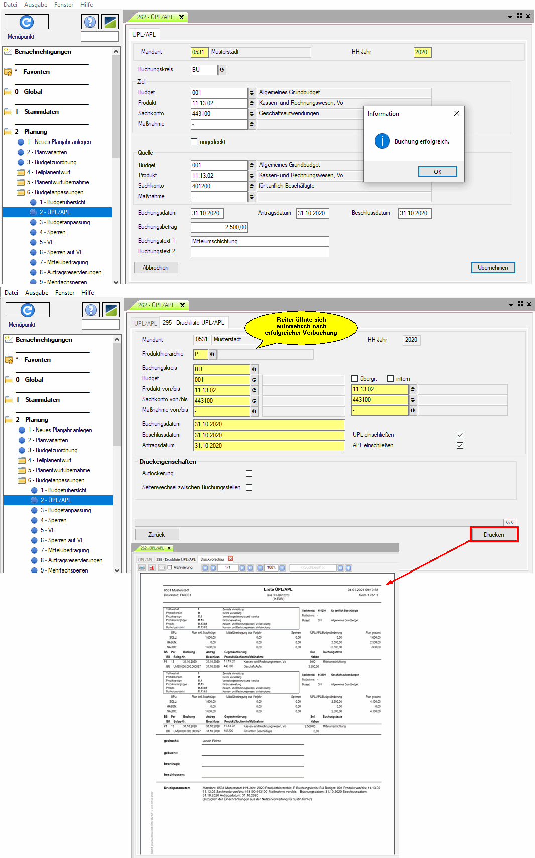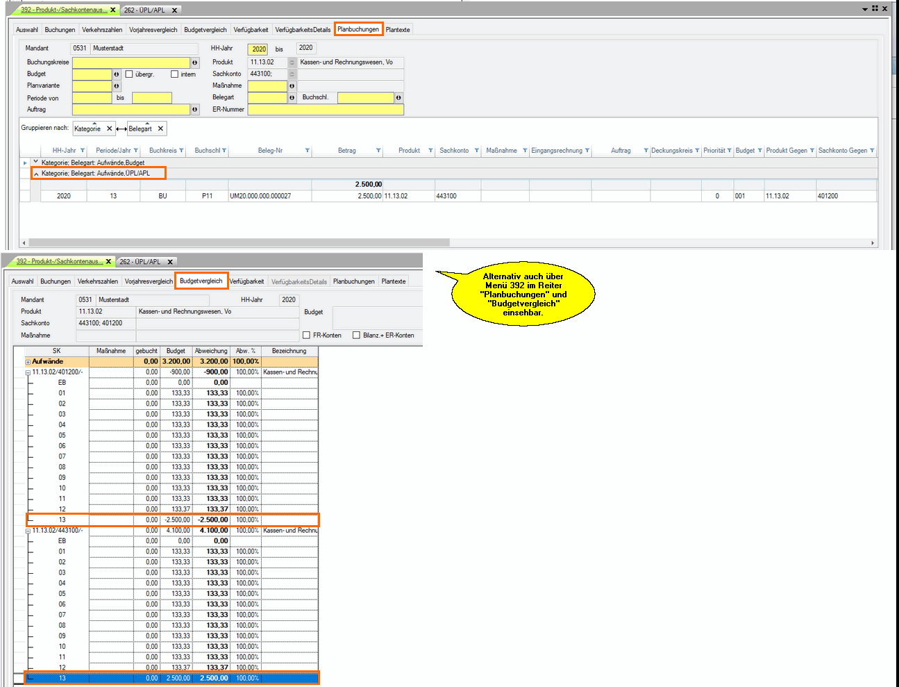 Im Rahmen einer Planbuchung können für bereits vorhandene Buchungsstellen budgetübergreifende Mittelumbuchungen für überplanmäßige Ausgaben (ÜPL) unter Angabe der Einnahme- und der Abgabebuchungsstelle, sowie der Datumseingaben, des Umbuchungsbetrages und eines Buchungstextes erzeugt werden. Die Bereitstellung von Mitteln für außerplanmäßige Ausgaben (APL), d. h. es existiert hierfür noch kein Planansatz, wird durch die Auswahl der Option „ungedeckt“ realisiert und bewirkt eine Planerhöhung in Höhe des Buchungsbetrages, da es keine Gegenbuchung auf einer Abgabebuchungsstelle gibt. Die Buchung werden dann in Periode 13 erzeugt und können auch über die Produkt- und Sachkontenauskunft im Menü 392 im Reiter Verfügbarkeit oder dem Reiter Planbuchungen eingesehen werden.