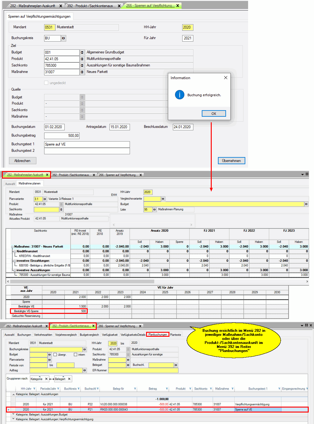 Analog der Vorgehensweise unter dem Menüpunkt „ Sperren “ kann hier für angelegte Verpflichtungsermächtigungen eine Sperre in Höhe des jeweiligen Buchungsbetrages angelegt werden. Durch die Eingabe des entsprechenden negativen Buchungsbetrages wird auch hier die Sperre wieder aufgehoben. Die Buchung ist ersichtlich im Menü 282 in jeweiliger Maßnahme/Sachkonto oder über die Produkt-/Sachkontenauskunft im Menü 392 im Reiter "Planbuchungen".