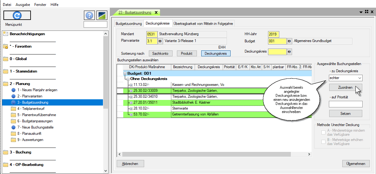 Mit der Zuordnung von Buchungsstellen zu Deckungskreisen und Prioritäten besteht die Möglichkeit, innerhalb der Budgets Regeln zur Deckungsfähigkeit weitere teils rechtlich geforderte Abgrenzungen zur gegenseitigen Deckung der Buchungsstellen vorzunehmen.