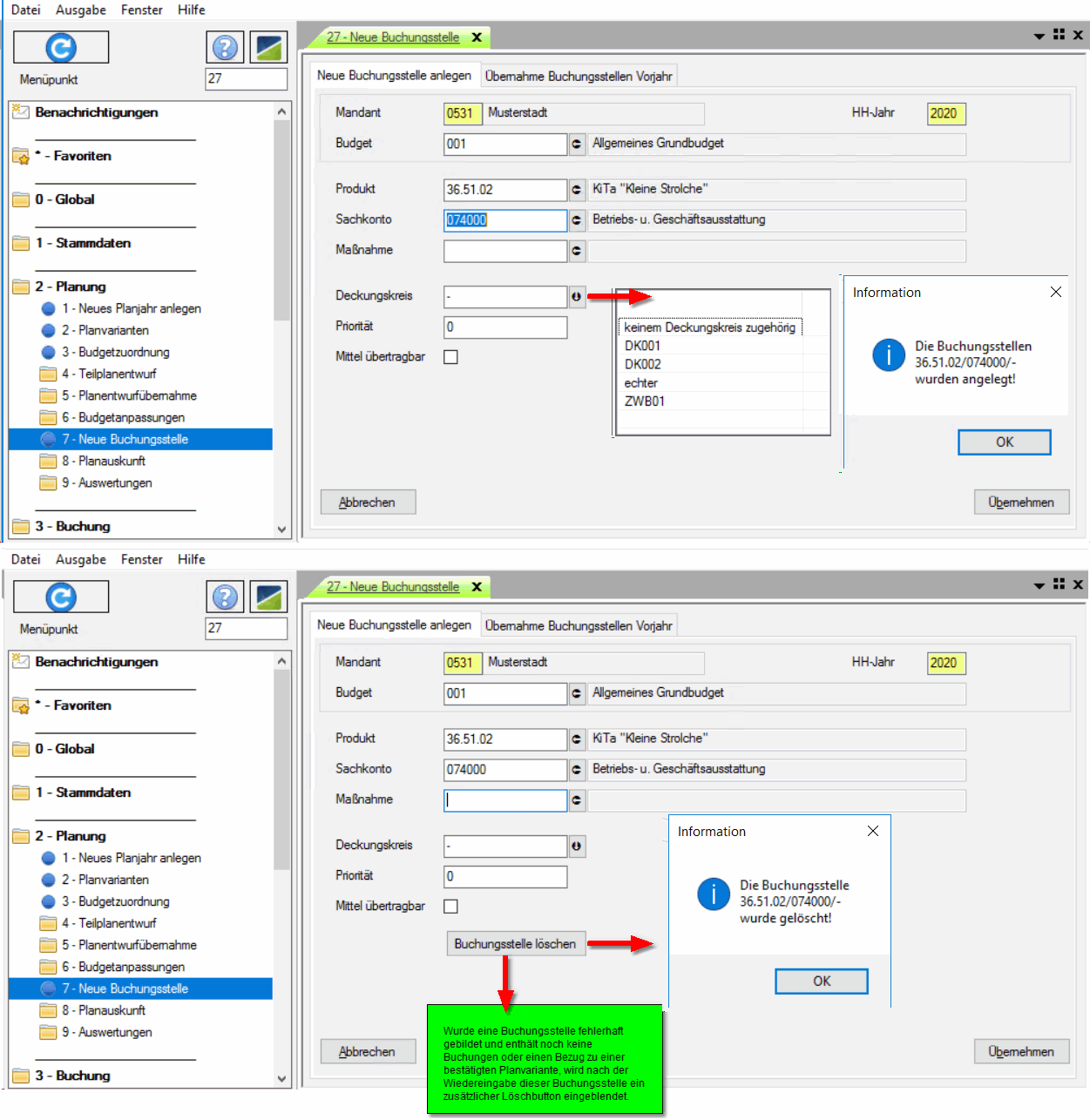 Löschen einer Buchungsstelle, welche noch keine Buchungen enthält und keinen Bezug zu einer bestätigten Planvariante hat