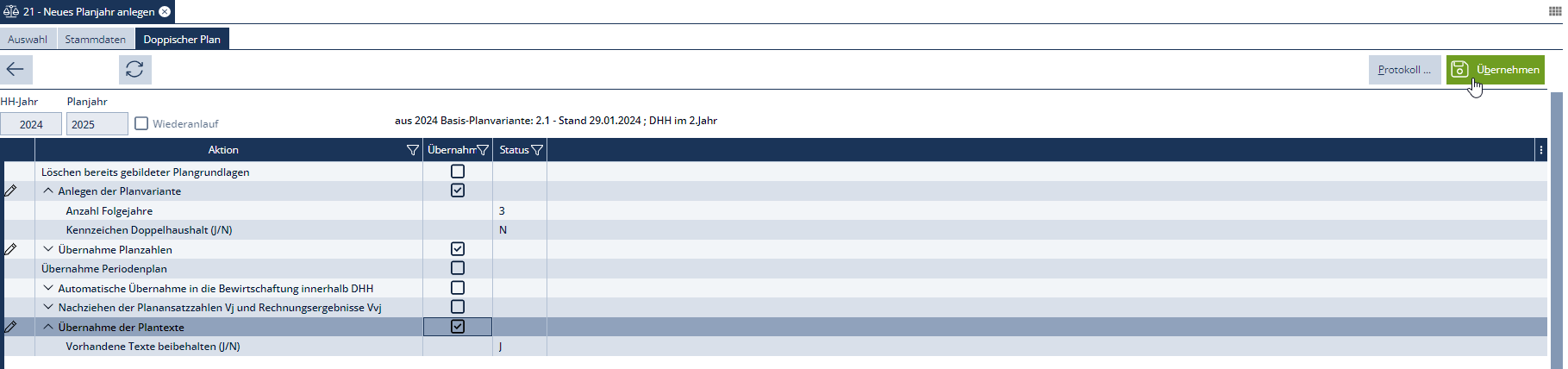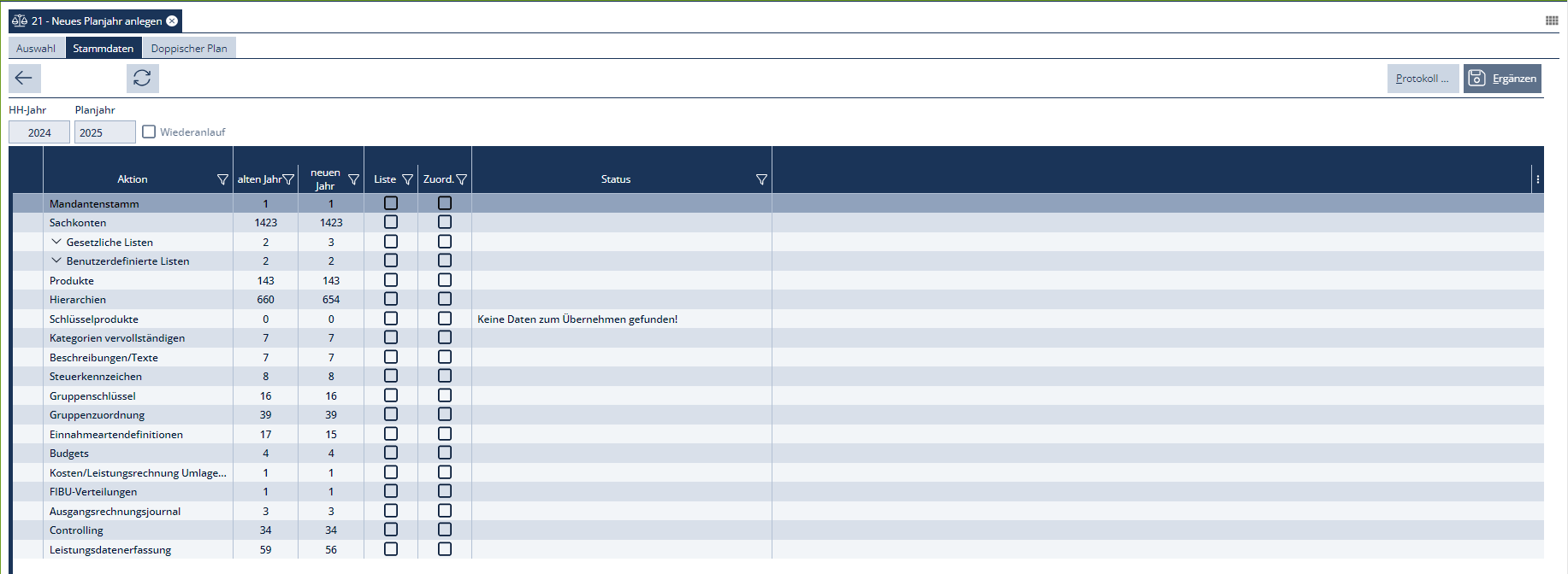 Für die ausgewählten Datenzeilen werden alle neu angelegten Stammdaten des Haushaltsjahres in das Planjahr übertragen, bereits übernommene Stammdaten bleiben unverändert erhalten