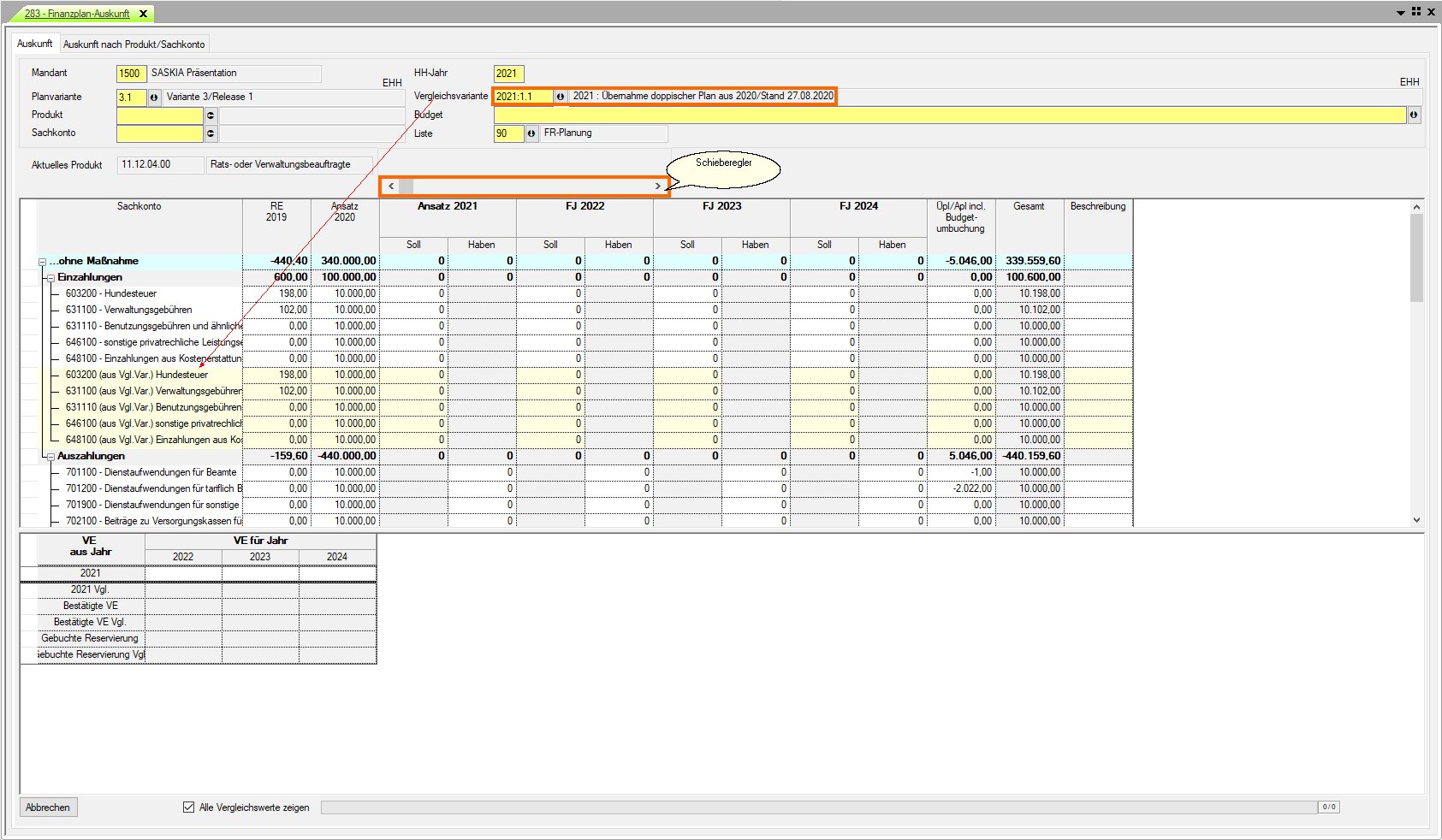 Nach Auswahl des Haushaltsjahres und der Planvariante werden zunächst alle angelegten Buchungsstellen für die Bearbeitung geladen und können entweder durch Eingabe in die Suchfelder „Produkt“ und „Sachkonto“ direkt angezeigt oder durch Verwendung des Schiebereglers nacheinander aufgerufen werden. Das Übersichtsfenster zeigt dann für die ausgewählten Buchungsstellen die Spalten „Rechnungsergebnis Vorvorjahr“, „Ansatz Vorjahr“, „Ansatz HH-Jahr“ und die angelegten Folgejahre. Eine Eingabe von Planwerten ist in diesen Menüpunkten nicht möglich, da es sich um eine reine Auskunft handelt. In der Planauskunft besteht ebenfalls die Möglichkeit der Anzeige nach Produkt/Sachkonto . Außerdem ist die Eingabe einer Vergleichsvariante möglich.