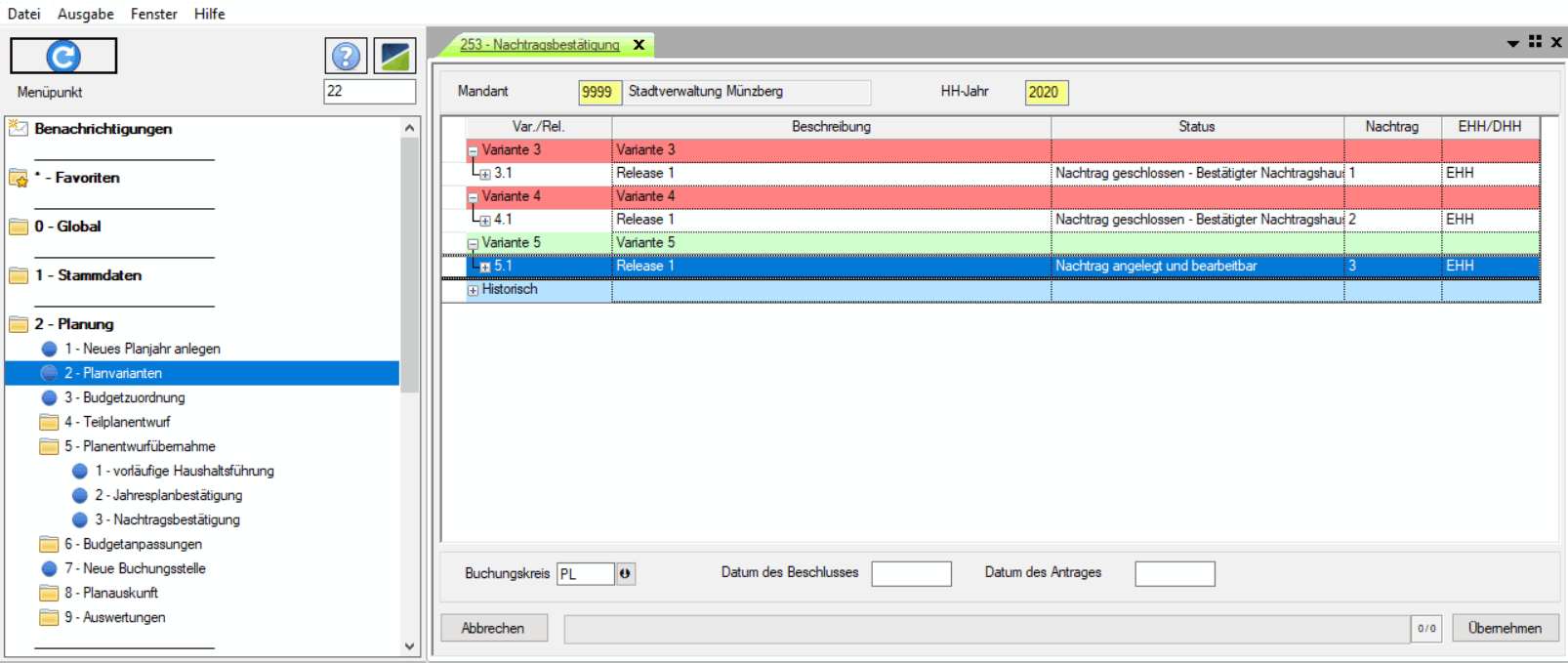 Aus der endgültigen Haushaltsführung heraus, können Planungsänderungen nur noch in abgeleiteten Nachträgen erfasst werden, die auf einem Nachtragsantrag sowie einem entsprechenden Stadtratsbeschluss basieren. Diese Planungsnachbearbeitungen werden dann im Rahmen der Nachtragsbestätigung in das Programm übernommen und bilden so die aktuelle Arbeitsgrundlage.