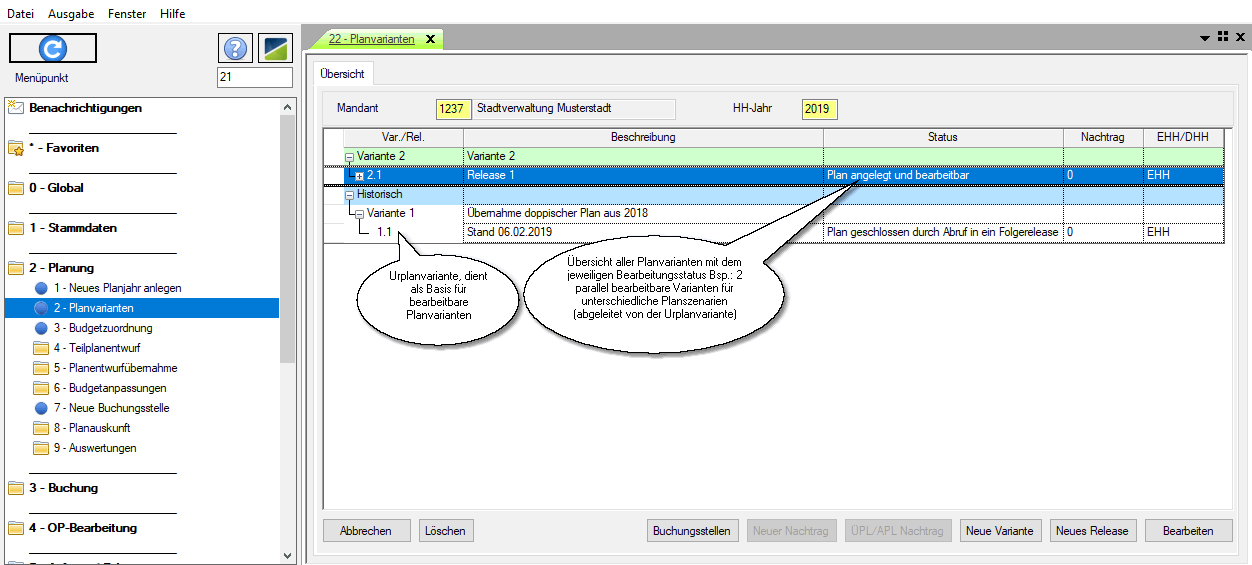 Über den Button "Buchungsstellen" kann für alle markierten Planvarianten im Status "... und bearbeitbar" die Buchungsstellenpflege vorgenommen werden. Außerdem können aus dieser Übersicht heraus über die Buttons „Neue Variante“ oder "Neues Release" neue Folgestände der aktuellen Planvarianten angelegt und abgeleitet werden. Zu jeder neu erstellten Variante können weiterhin unterschiedliche Releasestände existieren, die über den Button „Neues Release“ erstellt werden. Wenn bereits eine Jahresplanbestätigung durchgeführt wurde und weitere Änderungen in der Planung notwendig werden, kann über den Button „Neuer Nachtrag“ eine weitere bearbeitbare Planvariante angelegt werden, die ebenfalls dem Anlegen einer neuen Variante entspricht.