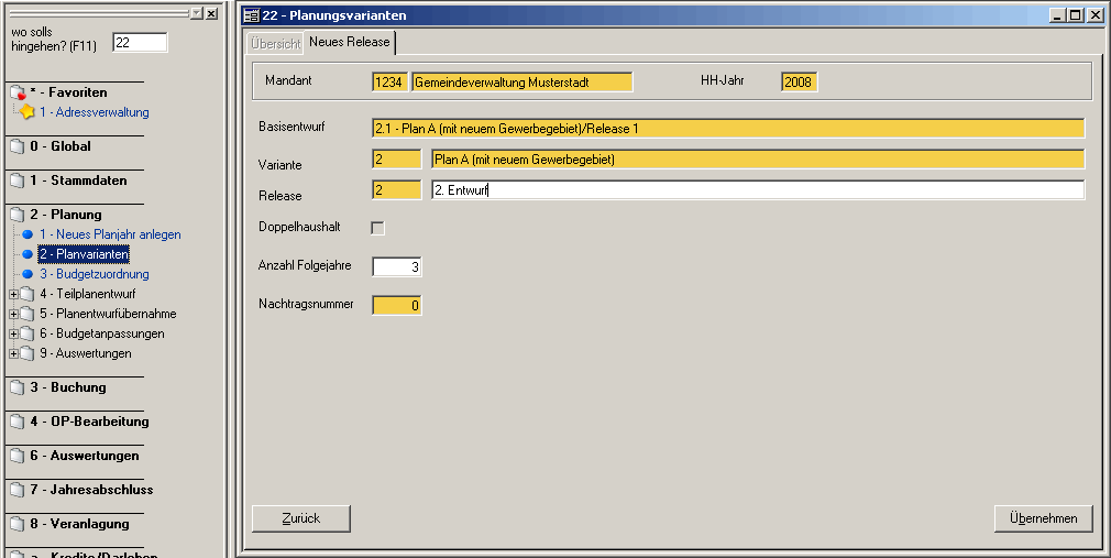 Die Anlage einer neuen Variante oder eines neuen Releasestandes ist nur für Planvarianten möglich, die im Status "Plan angelegt und bearbeitbar" oder "vorläufige Haushaltsführung" stehen. Planvarianten mit Status "endgültige Haushaltsführung" oder "Nachtrag angelegt und bearbeitbar" können lediglich einen neuen Nachtrag als Folgestand erhalten.