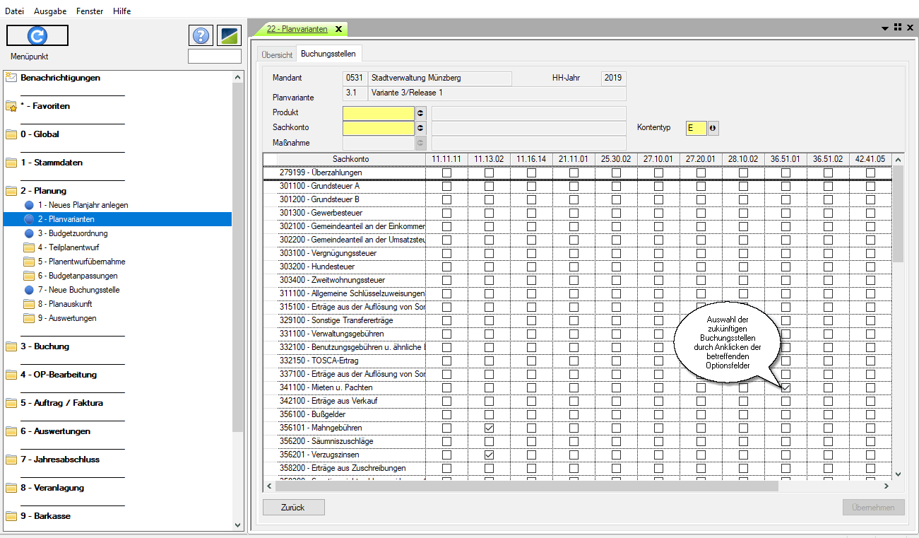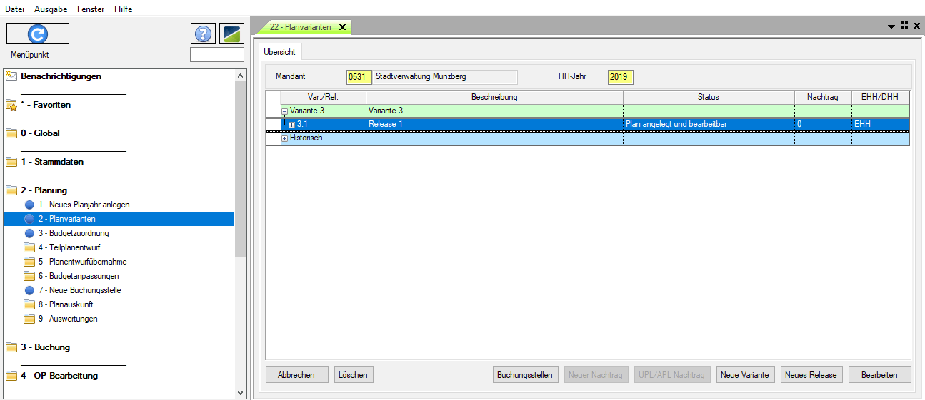 Voraussetzung für den Aufruf der Funktion über den Button „Buchungsstellen“ ist eine angelegte und bearbeitbare Planvariante.