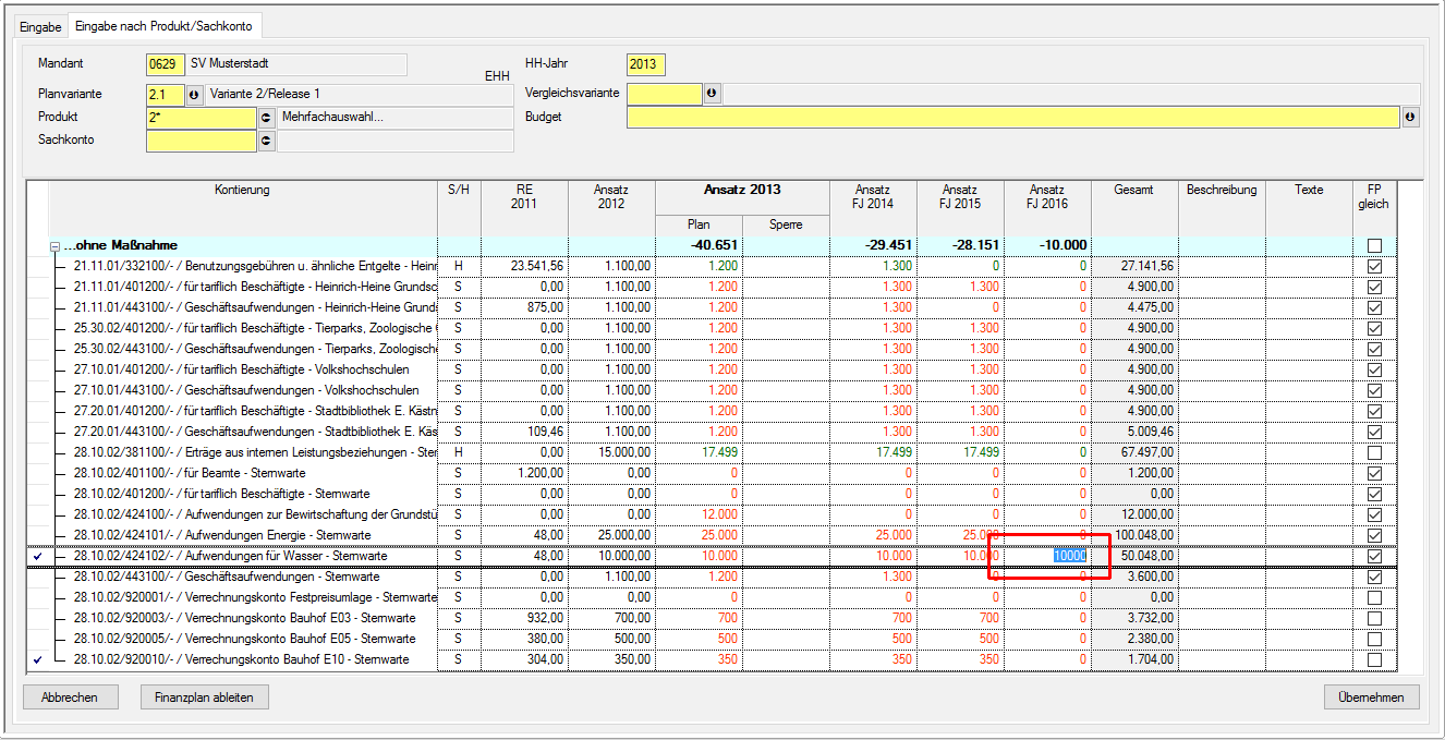 Nach Auswahl der Planvariante werden zunächst alle angelegten Buchungsstellen für die Bearbeitung geladen. Das Übersichtsfenster zeigt dann für die ausgewählten Buchungsstellen die Spalten "Soll/Haben", "Rechnungsergebnis", "Ansatz Vorjahr", "Ansatz Planjahr" mit den Spalten "Plan" und "Sperre" sowie angelegte Folgejahre. Die Eingabe der absoluten Planwerte für das Planjahr und die Folgejahre erfolgt wie auch in der Registerkarte Eingabe direkt in die Felder der Tabelle. Dabei werden die Planzahlen vom Programm automatisch farbig dargestellt - Erträge in grüner, Aufwendungen in roter Farbe.