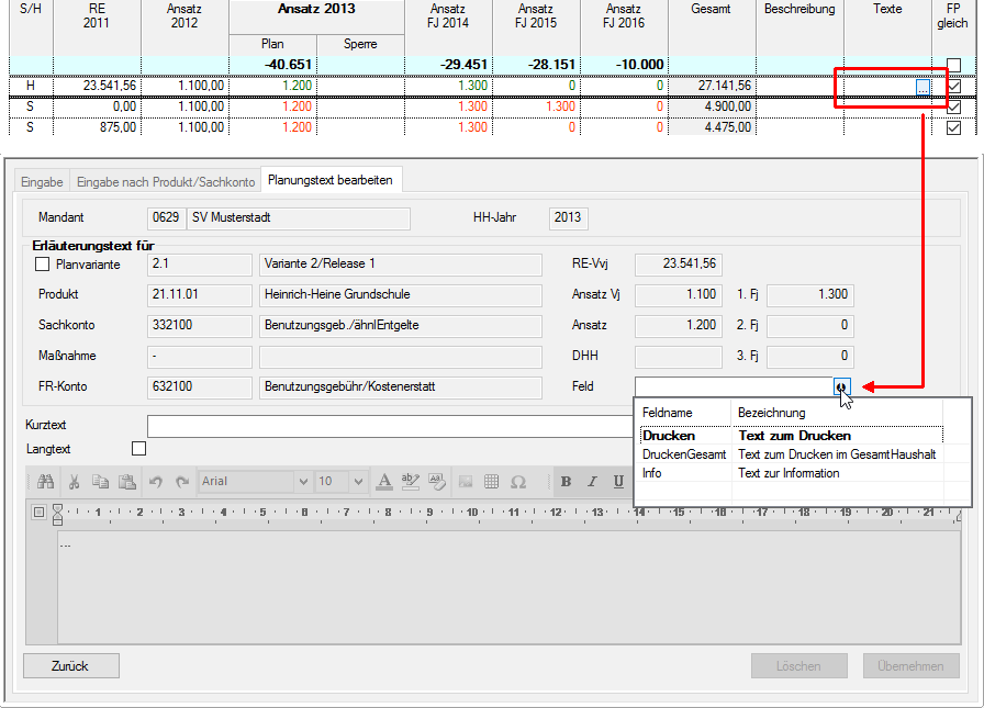 Zur Pflege von Planerläuterungstexten öffnet sich nach Betätigung des Buttons "Feld" in der Spalte "Texte" eine separate Erfassungsmaske. Weitere Erklärungen dazu finden Sie im Abschnitt Pflege Planerläuterungstexte .