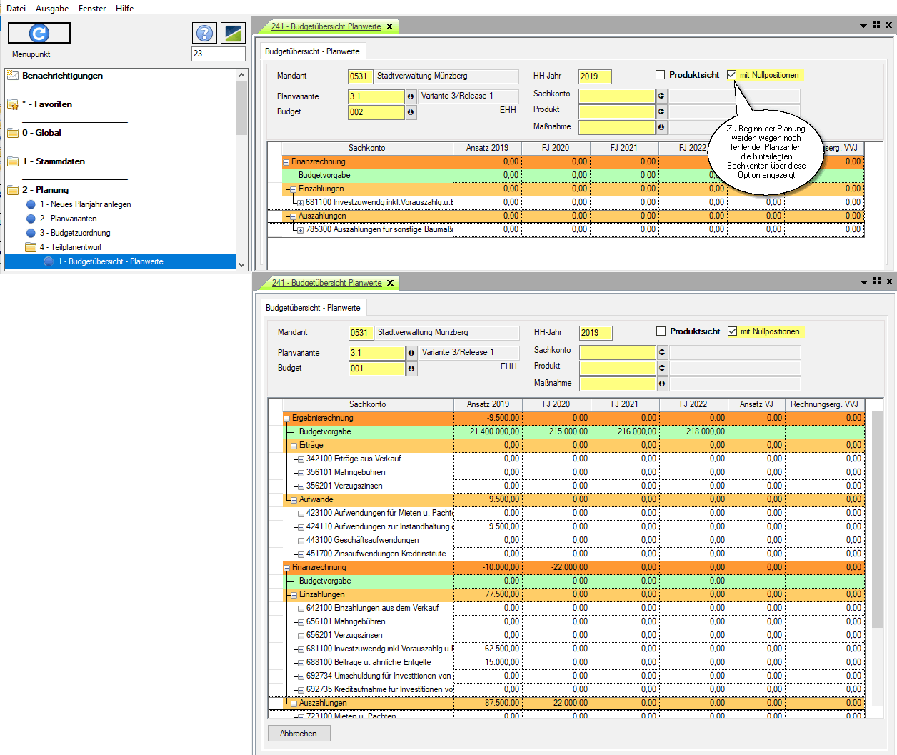 Die Auskunftsfunktion öffnet nach Auswahl einer Planvariante und eines Budgets die Übersicht aller Buchungsstellen der Ergebnisrechnung, unterteilt nach Ertrags- und Aufwandskonten, der Finanzrechnung, unterteilt nach Einzahlungs- und Auszahlungskonten und den Budgetvorgaben.