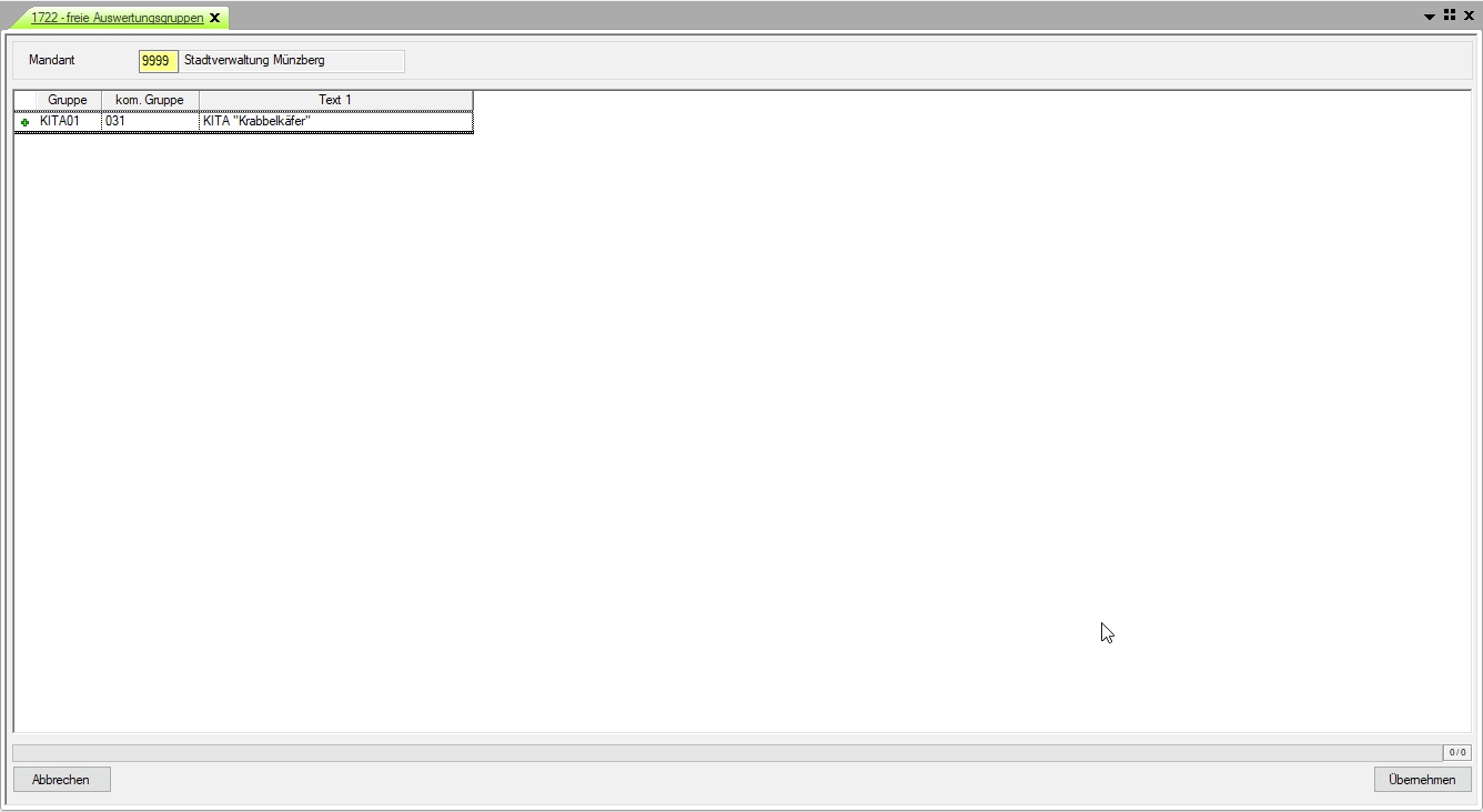 Ohne die Eingabe im Feld "kom. Gruppe" erstreckt sich der Wirkungsbereich der freien Gruppe über alle vorhandenen kommunalen Gruppen. Soll die freie Gruppe nur im Bereich einer speziellen kommunalen Gruppe wirksam sein, ist eine entsprechende Auswahl im Feld "kom. Gruppe" zu treffen.