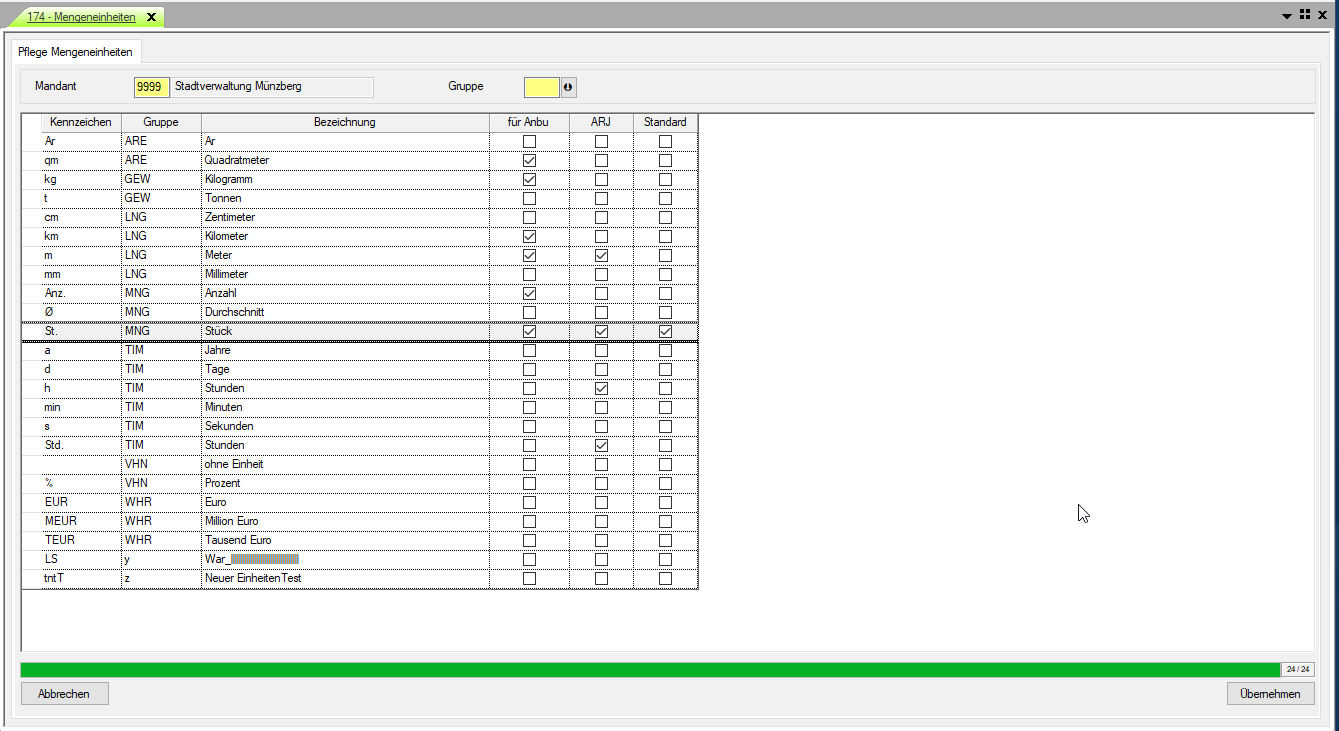 Auswahl von Mengeneinheiten im durch Setzen eines Hakens in der Spalte "für Anbu" und Bestätigung der Auswahl mittels des Button "Übernehmen". Ebenso kann eine Mengeneinheit in der Spalte "Standard" ausgewählt werden, die in der Anlagenbuchhaltung standardmäßig vorgeblendet werden soll.