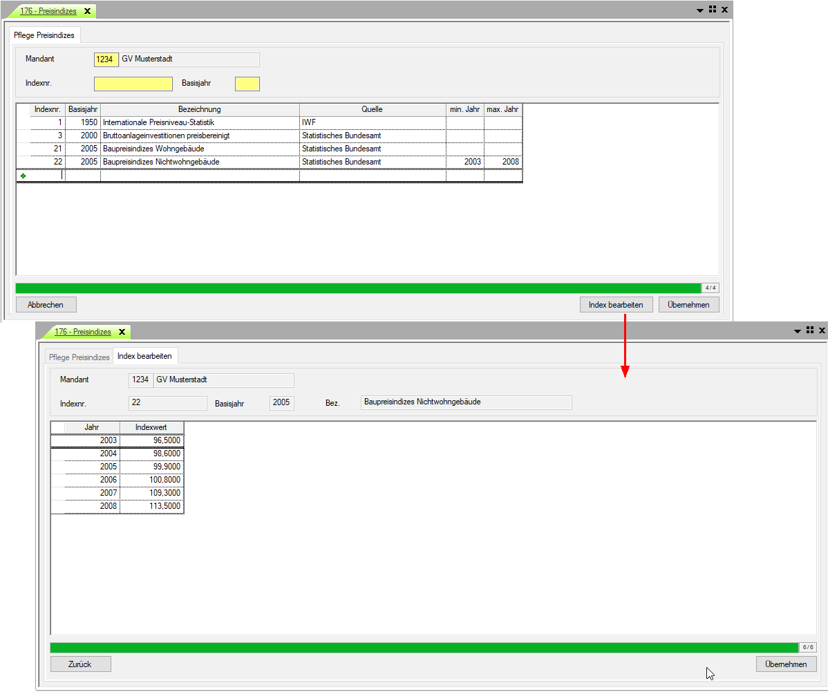 Abbrechen Rückkehr in das letzte aktive Dialogfenster Index bearbeiten Es öffnet sich der Dialog zur Eingabe der Preisindexwerte Übernehmen Speicherung der erfassten Daten, der Preisindex wird angelegt