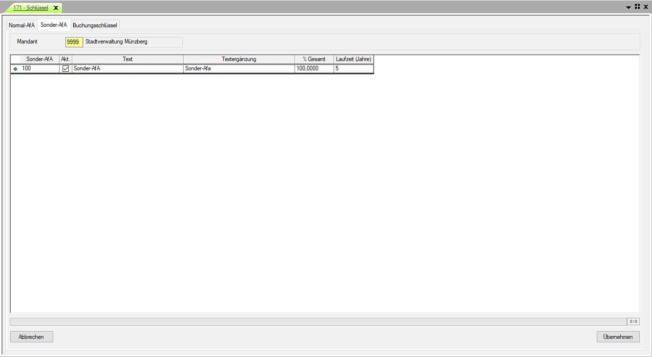 Auf dieser Registerkarte besteht die Möglichkeit, Formen der Sonderabschreibungen anzulegen und zu bearbeiten.