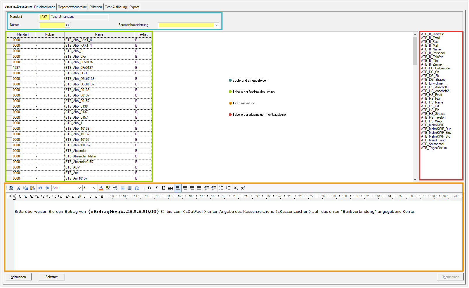 Jede Zeile in dieser Tabelle steht für einen Allgemeinentextbaustein.Die sogenannten ATB's werden als Platzhalter im Textfeld des BTB's mittels der Schreibweise in geschweiften Klammern (z.B. {ATB_B_Name} dargestellt. Diese Platzhalter sind nötig um Eingaben der Benutzerverwaltung oder der Mandantenverwaltung einzubinden. Allgemeine Textbausteine im Format ATB_B_... und ATB_DG_... liefern dem übergeordneten Basistextbaustein danach in Abhängigkeit des angemeldeten Nutzers die entsprechenden Eingaben aus der Benutzerverwaltung. ATB's im Format ATB_HS_... beziehen sich auf die hinterlegten Eingaben in der Mandantenverwaltung des verwendeten Mandanten.