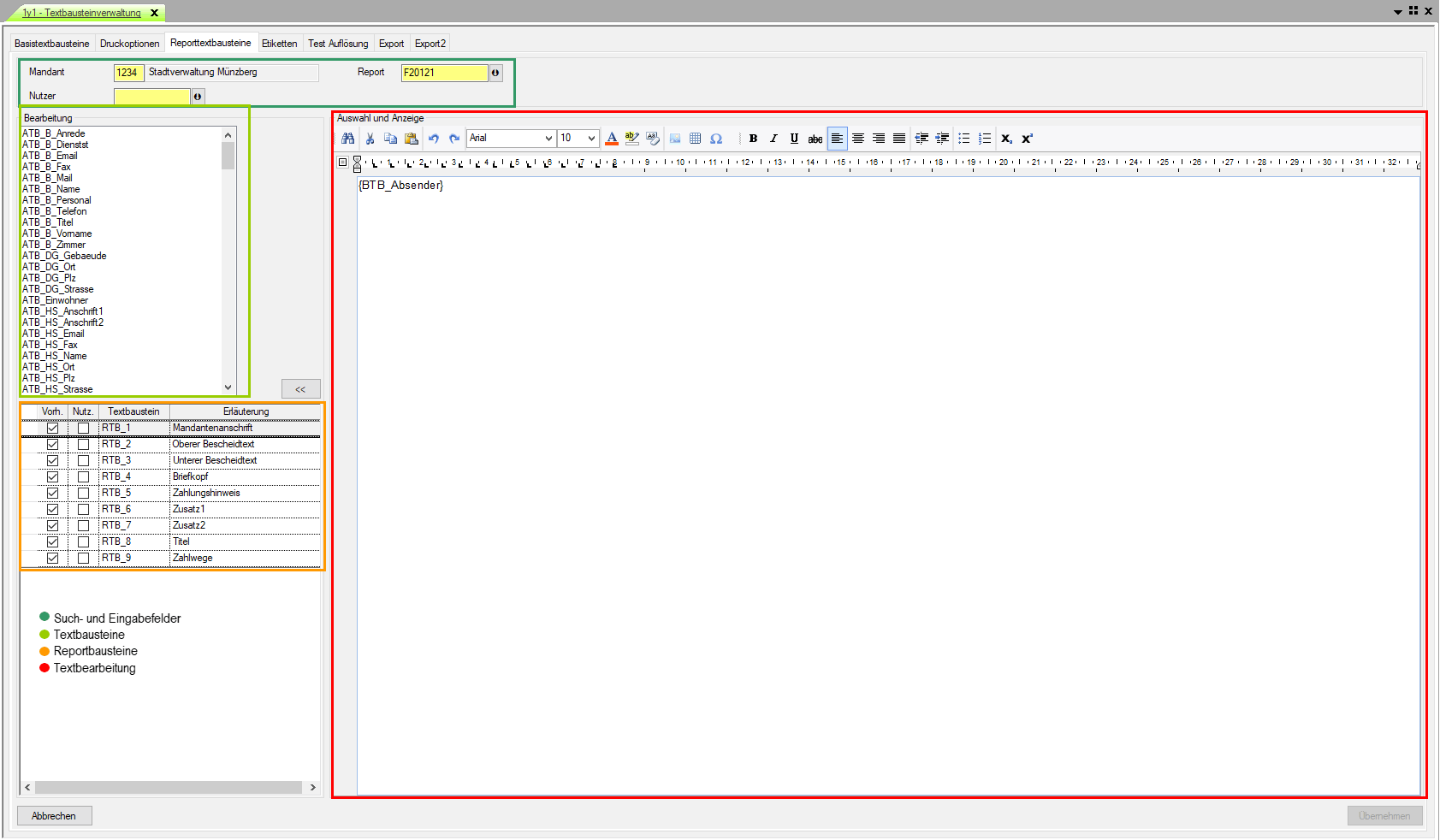 zuzuordnen und abschließend über den Button "Übernehmen" zu speichern. Mit der Einrichtung der übrigen benötigten RTB's ist danach analog zu verfahren. Änderungen oder Löschungen von bereits zugeordneten Textbausteinen können nach erneuten Aufruf des RTB's im Textbearbeitungsfenster vorgenommen werden.