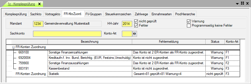 Auf dieser Registerkarte des Menüpunktes 1z - Komplexprüfung erfolgt die Prüfung der FR-Kontenzuordnung. Es wird empfohlen, die Überprüfung in zeitlich regelmäßigen Abständen bzw. nach Änderungen in den Stammdaten durchzuführen. Die Komplexprüfung kann auch in einem Lauf ( Registerkarte "Komplexprüfung" ) durchgeführt werden.