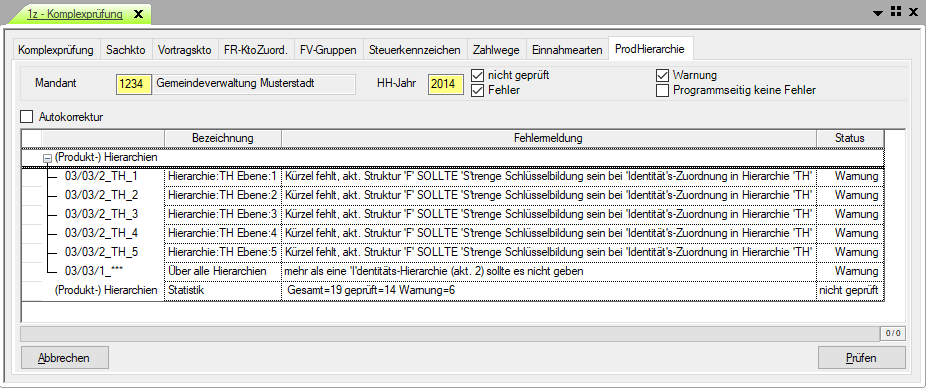 Auf dieser Registerkarte des Menüpunktes 1z - Komplexprüfung erfolgt die Prüfung der Produkthierarchien. Es wird empfohlen, die Überprüfung in zeitlich regelmäßigen Abständen bzw. nach Änderungen in den Stammdaten durchzuführen. Die Komplexprüfung kann auch in einem Lauf ( Registerkarte "Komplexprüfung" ) durchgeführt werden.