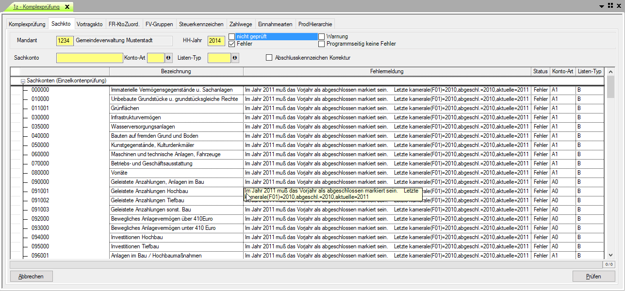 Nach Eingabe von Mandant und Haushaltsjahr wird mit dem Button „Prüfen“ die Überprüfung gestartet. Die zu prüfenden Daten können über weitere Kriterien (Sachkonto, Konto-Art, Listen-Typ) eingegrenzt werden. Im Übersichtsfenster sind nach dem Extrahieren des Eintrages durch Klick auf
