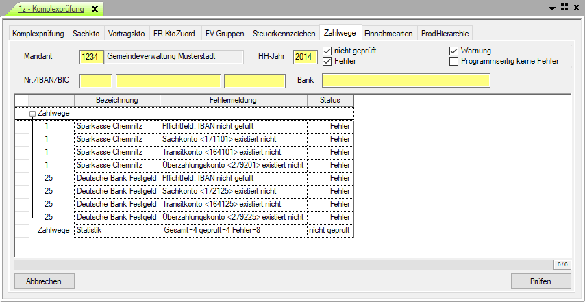 Auf dieser Registerkarte des Menüpunktes 1z - Komplexprüfung erfolgt die Prüfung der Zahlwege. Es wird empfohlen, die Überprüfung in zeitlich regelmäßigen Abständen bzw. nach Änderungen in den Stammdaten durchzuführen. Die Komplexprüfung kann auch in einem Lauf ( Registerkarte "Komplexprüfung" ) durchgeführt werden.