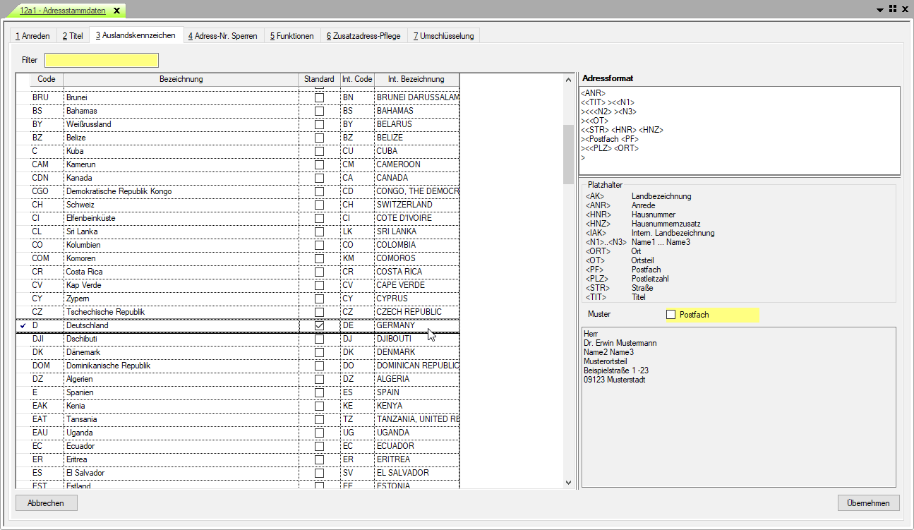 Code Eingabe bzw. Anzeige eines Länderkürzels (Es werden die zum Auslieferungszeitpunkt aktuellen Länderschlüssel mitgeliefert) Bezeichnung Eingabe bzw. Anzeige der Länderbezeichnung Postfach Mit aktiver Option kann ein abweichendes Postfach-Adressformat erfasst werden