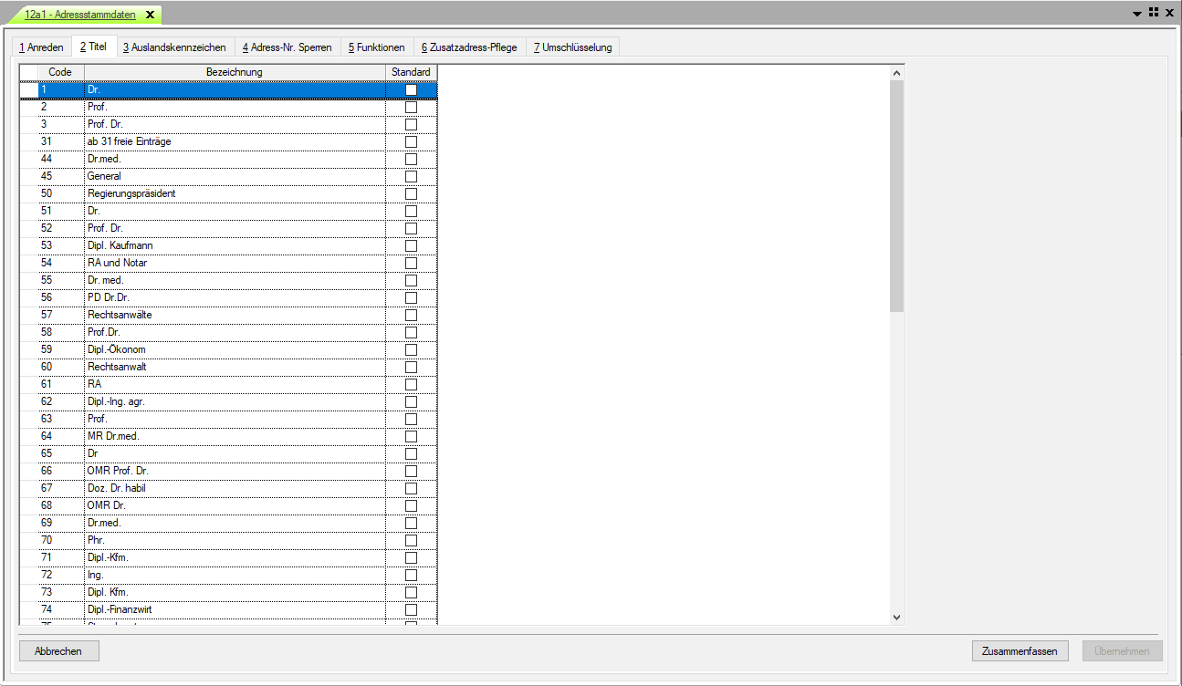 Die Funktion dient der Hinterlegung gebräuchlicher Titel, die anschließend in der Adressverwaltung bei der Anlage Anschriften (Schalterstellung F09 auf "Ja") oder im Menü 12a3 zur Anlage von Personenkonten (bei Schalterstellung F09 auf "Nein") verwendet werden können