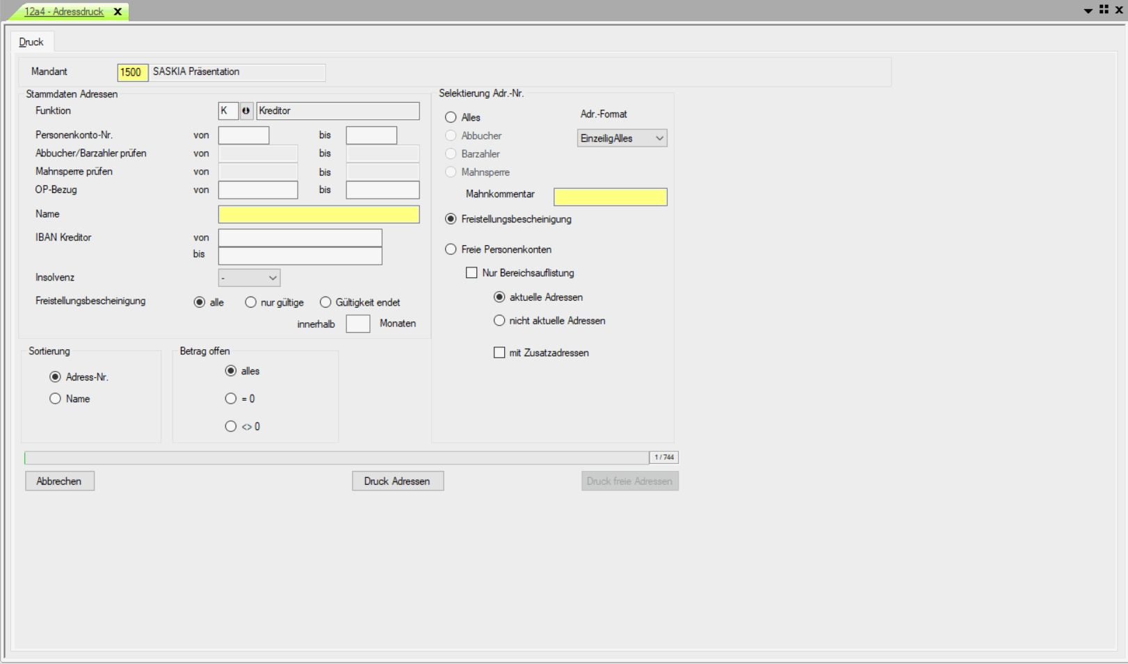 Im Bereich "Stammdaten Adressen" kann der Druckbereich gezielt durch Eingaben von bestimmten Kriterien (Funktion, PK-Nr., ...) gefiltert werden. Die Anzeige der Datenauswahl beim Druck bestimmt die Wahl der Sortierung im unteren Bereich des Fensters. Zur weiteren Eingrenzung des Druckbereiches stehen außerdem zusätzliche Optionsfelder im Bereich "Selektierung Adr.-Nr." zur Verfügung. Außerdem kann eine Liste der kreditorischen Personenkonten erstellt werden, die in der PK-Verwaltung im Reiter "Freist.-Besch. zur BASt." Informationen enthalten. Der Druck startet über den Button "Druck Adressen". Eine Anzeige bzw. Druckausgabe aller bisher noch nicht verwendeten Adressnummern kann über den Button "Druck freie Adressen" gestartet werden.