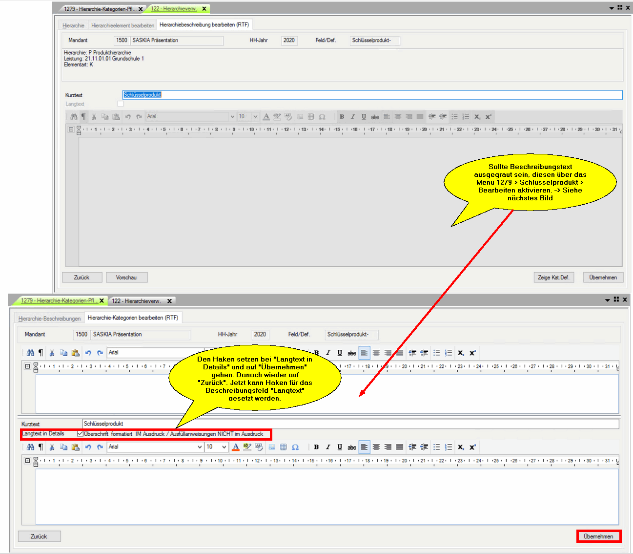 Über den Button "Zeige Kat.-Def." ist auch jederzeit die Anzeige der in der Kategorieanlage vordefinierten Ausfüllanleitung möglich, um ein einheitliches Erstellen der Beschreibungstexte hinsichtlich der Inhalte und Formatierungen zu gewährleisten.