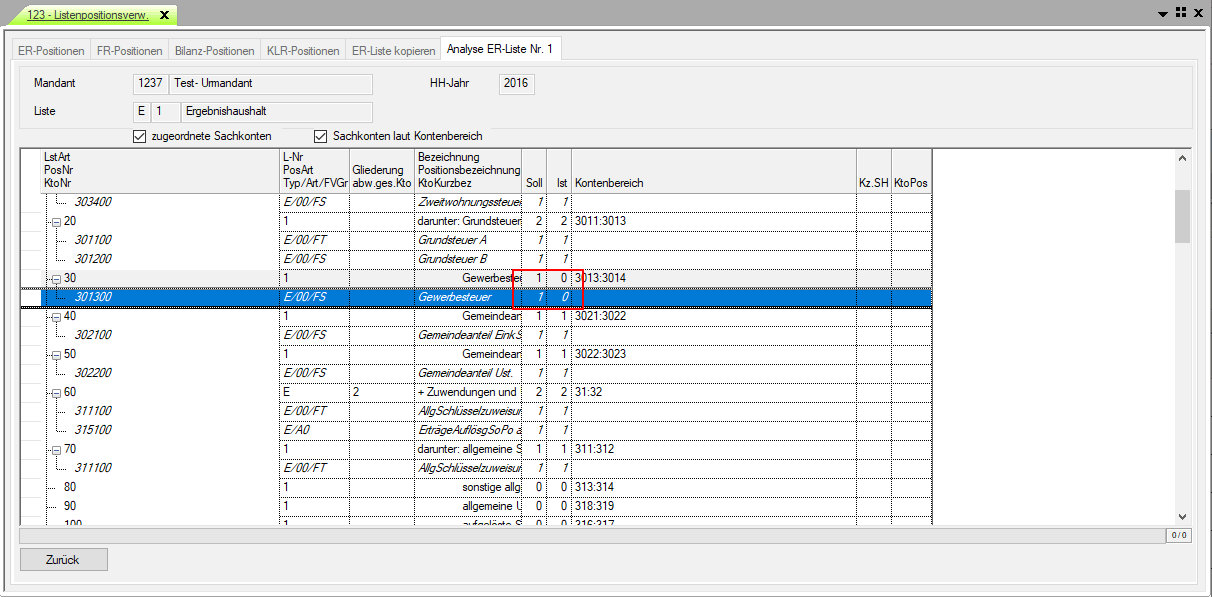 Um vor einem möglichen Kopieren bzw. Überschreiben einer Auswertungsliste aus dem Schattenmandanten erkennen zu können, welche Veränderungen an bereits angelegten eigenen Listen durch veränderte Kontenzuordnungen eintreten, können in der Analyse die Unterschiede der einzelnen Positionszeilen gegenüber gestellt werden. Dazu ist es erforderlich, die zu vergleichenden Listen im Dialogfenster "Listen kopieren" durch einen Doppelklick auf den Zeilenkopf zu markieren und anschließend den Button "Analyse" zu betätigen. Dabei festgestellte Abweichungen werden durch Abweichungen in den Spalten "Soll" / "Ist" dargestellt