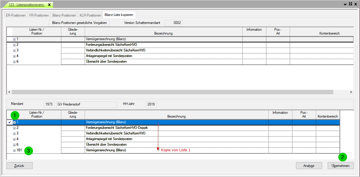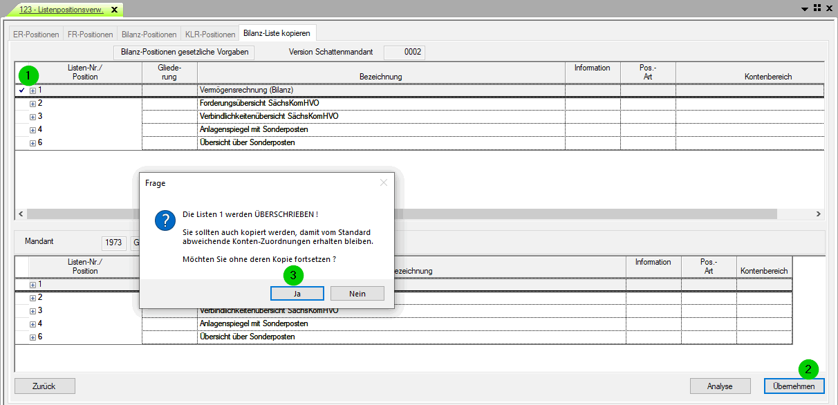 Das Dialogfenster zeigt in der oberen Auflistung die verfügbaren Mustervorlagen und darunter die im bearbeiteten Mandanten vorhandenen Auswertungslisten. Zur Erstellung von Sicherheitskopien bereits vorhandener Listen wird im unteren Übersichtsfenster die betreffende Liste durch doppelten Mausklick auf den Zeilenkopf markiert. Mit Betätigung des Buttons "Übernehmen" wird danach eine weitere Liste gleichen Aufbaus und gleicher Kontenzuordnung erzeugt. Die Liste erhält dabei ausgehend von 10 die nächste freie Listennummer. Um eine Liste aus den Mustervorlagen zu importieren, wird die gewünschte Vorlagenliste in der oberen Übersicht durch Doppelklick auf den Zeilenkopf markiert. Soll eine eventuell bereits in der unteren Übersicht vorhandene Mandantenliste ersetzt werden, so wird auch diese Liste entsprechend markiert. Mit anschließender Betätigung des Buttons "Übernehmen" wird danach die Vorlagenliste an die Stelle der Mandantenliste gesetzt und gleichzeitig eine Kopie der Mandantenliste wie oben beschrieben angelegt. Wurde vor dem "Übernehmen" in der unteren Tabelle kein Eintrag markiert, wird bei der Ableitung eine zusätzliche Abfrage durch das Programm ausgegeben. Mit Bestätigung der Abfrage über den Button "Ja" wird danach ohne gleichzeitige Anlage einer Sicherheitskopie die vorhandene Liste durch die ausgewählte Mustervorlage überschrieben. Über den Button "Nein" wird der Vorgang abgebrochen und es sind Änderungen an den Einstellungen möglich.