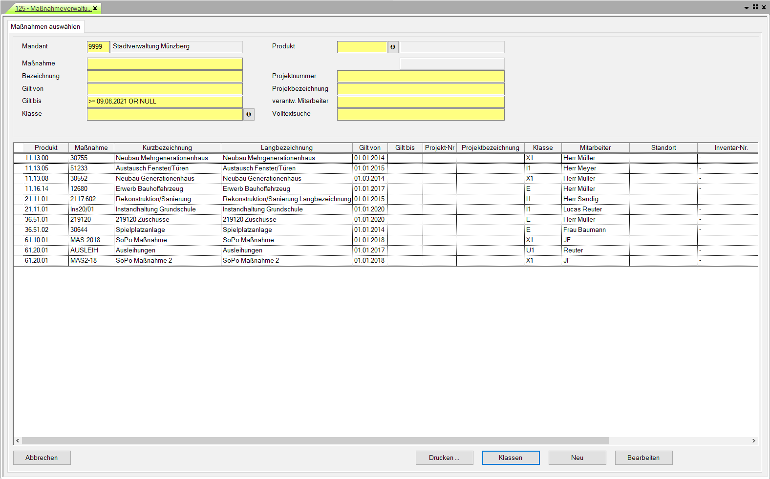 Zur Suche bzw. Anzeige einzelner Maßnahmen kann die Anzeige in dieser Maskenansicht gezielt über Suchfelder eingeschränkt bzw. nach bestimmten Kriterien gefiltert werden. Weitere Dialogfenster zur Neuanlage , Bearbeitung oder zum Druck von Maßnahmen werden über die gleichnamigen Buttons geöffnet. Über den Button "Klassen" kann eine Struktur für die spätere Einteilung der Maßnahmen angelegt werden. Die Klassen müssen vor Neuanlage von Maßnahmen angelegt werden! Wurde eine Maßnahme in der Übersicht durch Doppelklick mit einem " X " markiert, wechselt die Bezeichnung des Buttons "Bearbeiten" auf "Löschen" und die Maßnahme kann nach Betätigung des Buttons aus der Übersicht entfernt werden.