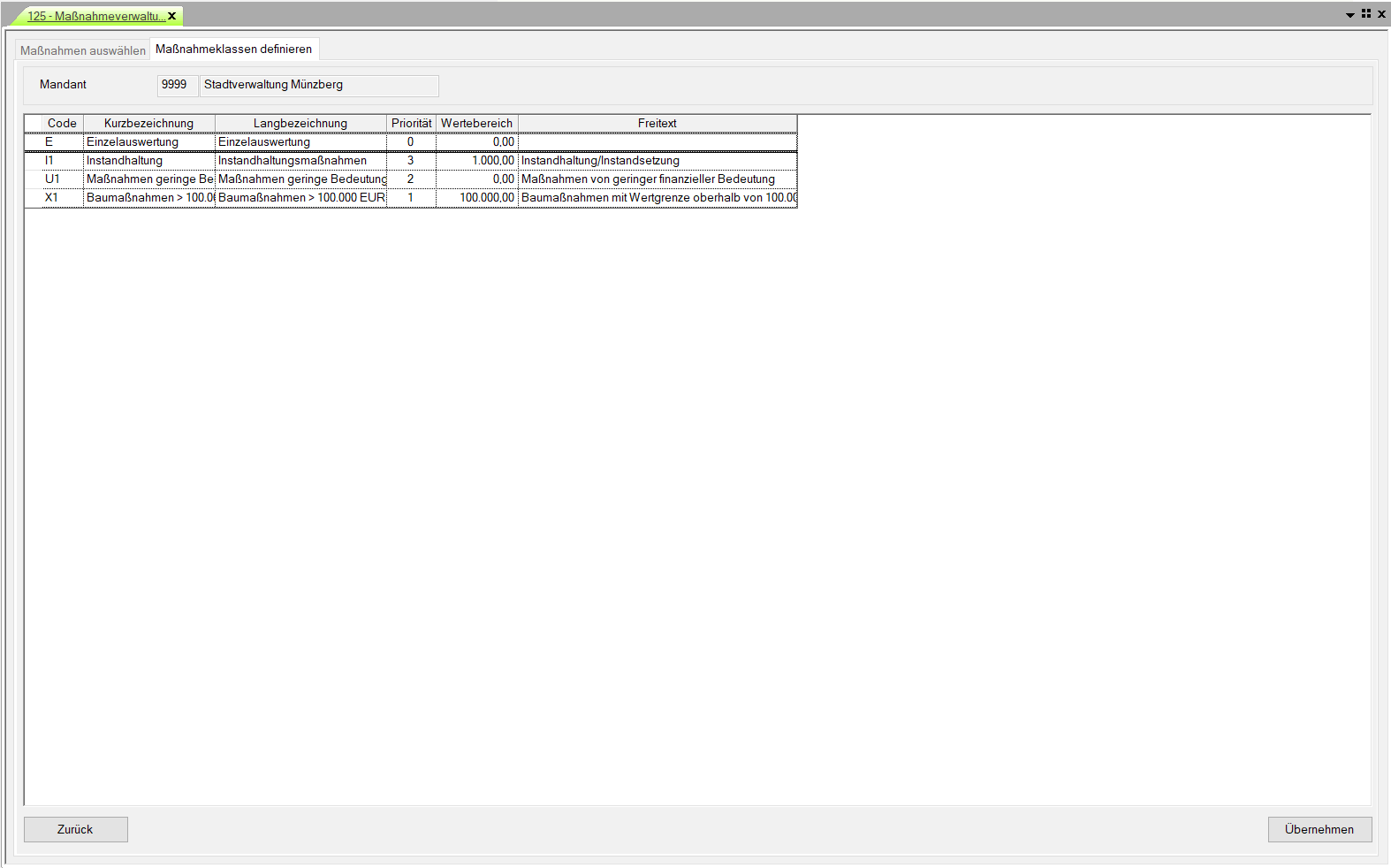Es öffnet sich der Dialog zur Neuanlage oder Bearbeitung von Maßnahmeklassen