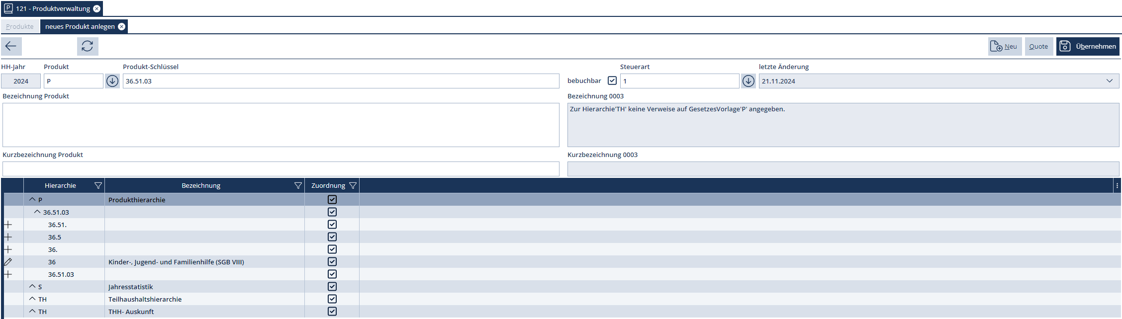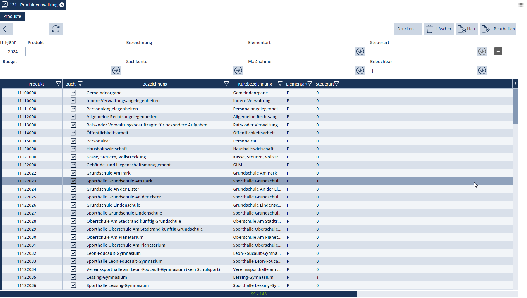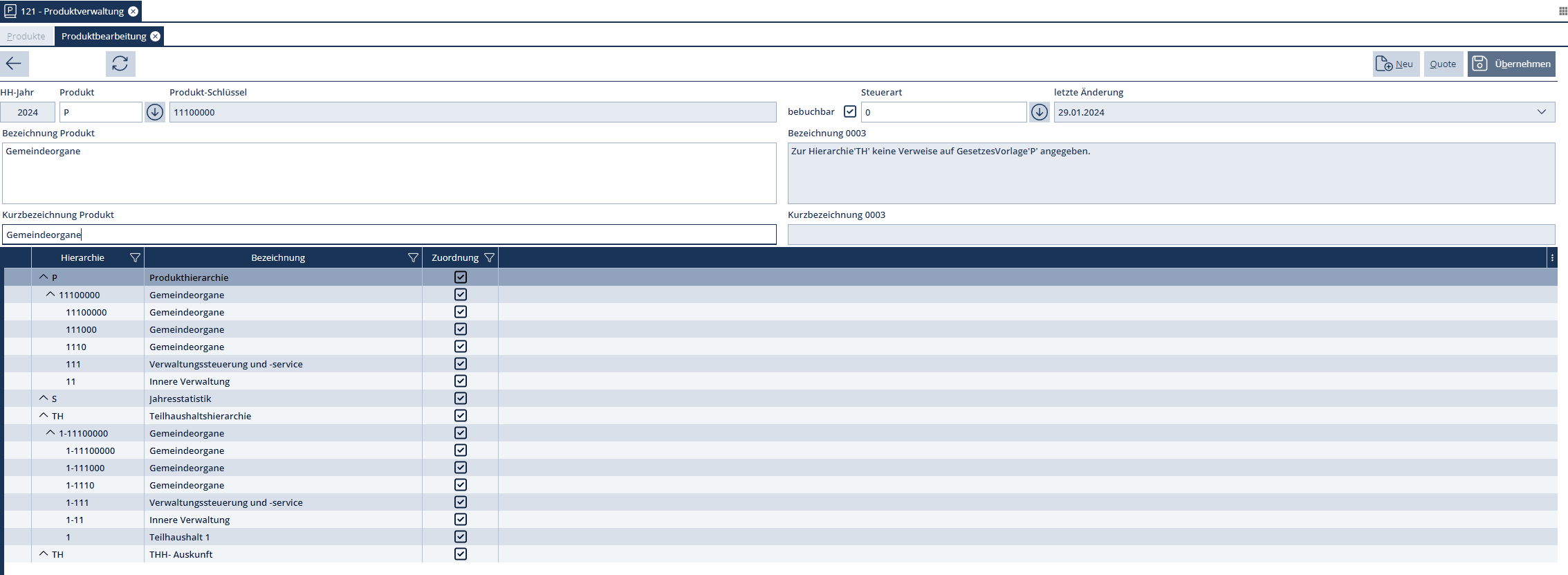 Diese Übersicht liefert die Anzeige aller bereits angelegten verwaltungsspezifischen Produkte und Kostenstellen.