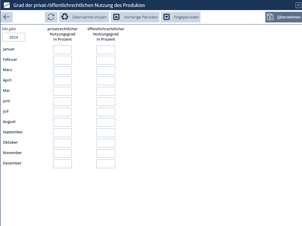 Prozentuale Angabe des jeweiligen Nutzungsgrades pro Periode. Die Quoteneingabe kann entweder in der Spalte "privatrechtlicher Nutzungsgrad" oder "öffentlich-rechtlicher Nutzungsgrad" hinterlegt werden. Insgesamt müssen die Quoten pro Periode 100% ergeben. Eine Übertragung der Werte in Folgeperioden oder vorherige Perioden ist über die jeweiligen Pfeile möglich.