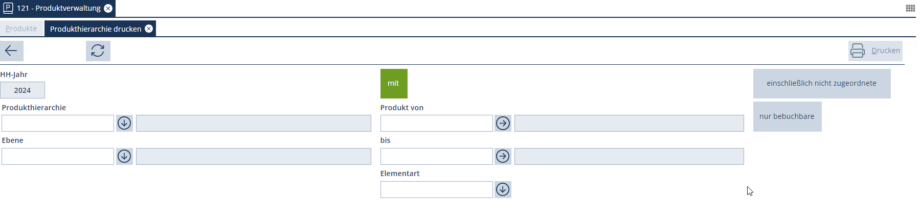 In Abhängigkeit der gesetzten Option „mit“ im Bereich „Produkte“ liefert die Übersicht der Produkthierarchie entweder die gegliederte Anzeige der Produkte bis auf die angegebene Ebene oder bei nicht gesetzter Option nur die Einzelproduktaufstellung. Dabei kann der Ausgabebereich optional durch Eingabe eines Produktbereiches oder einer bestimmten Elementart weiter eingegrenzt werden, bevor über den Button „Drucken“ die Ausgabe gestartet wird.