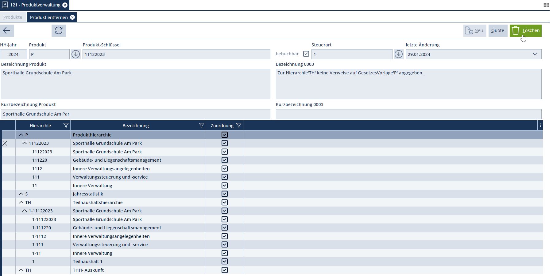 Nach Markierung des zu löschenden Produktes in der "Produktverwaltung" wird der Bearbeitungsdialog mit dem Button „Löschen“ geöffnet. Im geöffneten Bearbeitungsdialog „Löschen“ ist das ausgewählte Produkt bereits vorgeblendet und kann nach nochmaliger Betätigung des Buttons „Löschen“ dauerhaft entfernt werden.