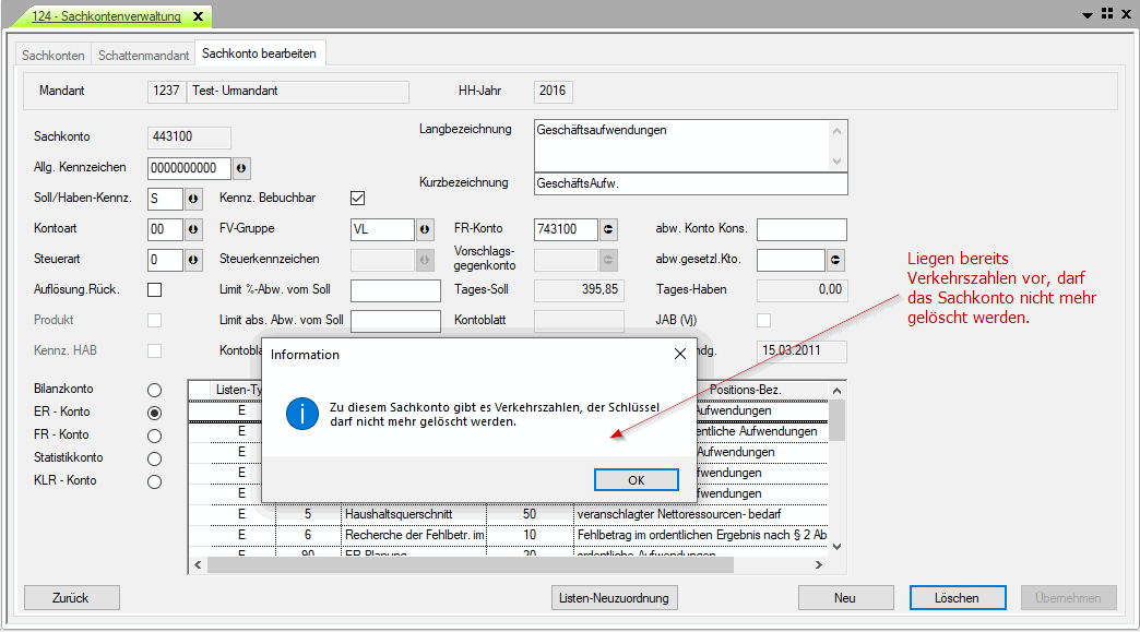 Es besteht in der Sachkontenverwaltung die Möglichkeit, fehlerhaft angelegte Sachkonten wieder zu entfernen, zu denen noch keine Plan- oder Verkehrszahlen im Programm existieren.
