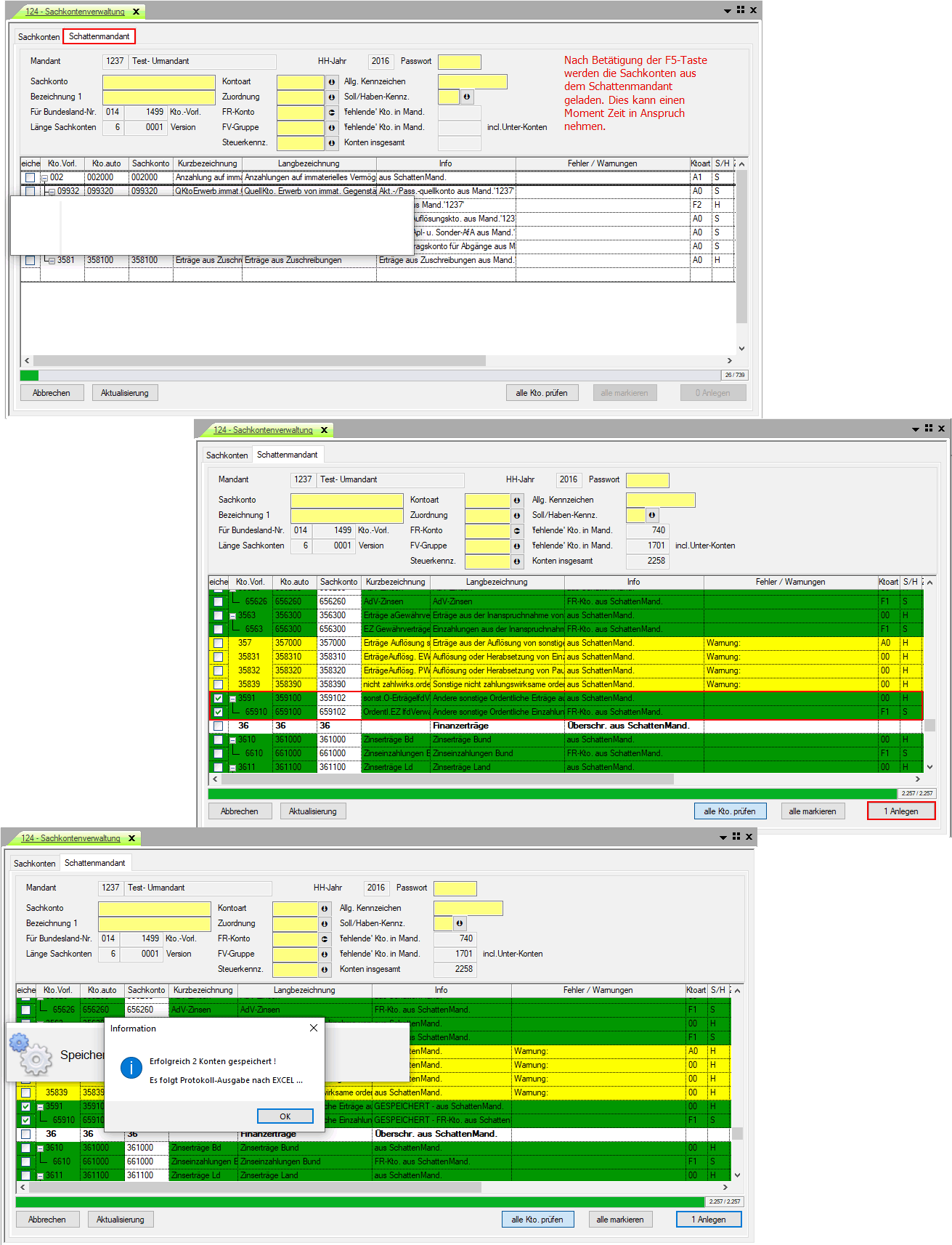 Danach findet die Anlage der ausgewählten Sachkonten in Verbindung mit allen verknüpften Konten (FR-Konto, evtl. Transitkonto, evtl. Überzahlungskonto, ...) statt. Die Übernahme startet über den Button "... Anlegen" und wird anschließend in Form einer EXCEL-Tabelle protokolliert. Die übernommenen Sachkonten werden nach erfolgreicher Übernahme aus dem Schattenmandanten grün in der Tabelle gekennzeichnet. Nach Rückkehr in die Sachkontenverwaltung über die Registerkarte „Sachkonten“ sind anschließend die neu angelegten Konten sofort auswählbar.