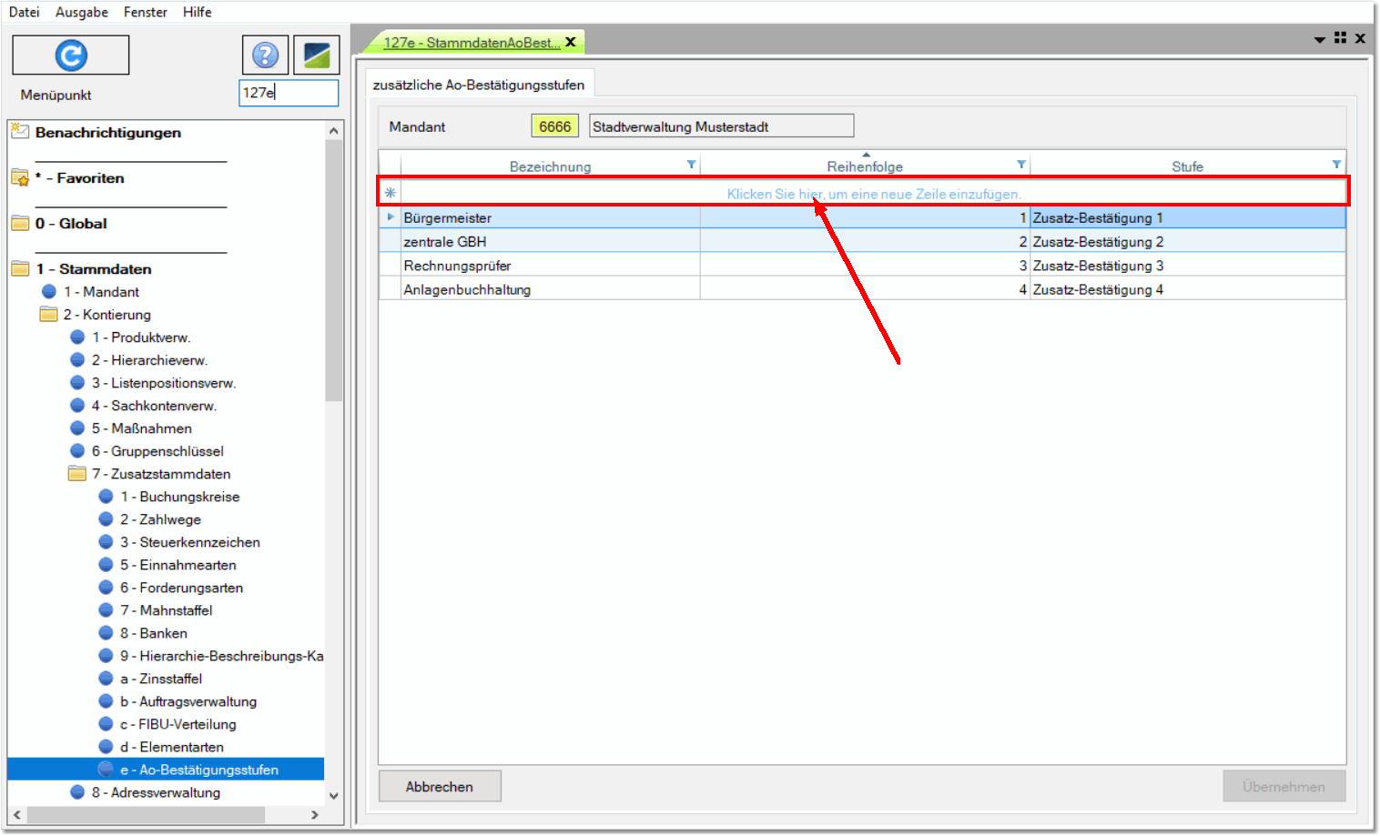 Mit Hilfe dieses Stammdatendialoges können neben den programmseitig bereits vorhandenen Standard-Bestätigungsstufen (sachlich, rechnerisch, Anordnung) zusätzliche Bestätigungsstufen für den Freigabe- und Zeichnungsprozess festgelegt werden.