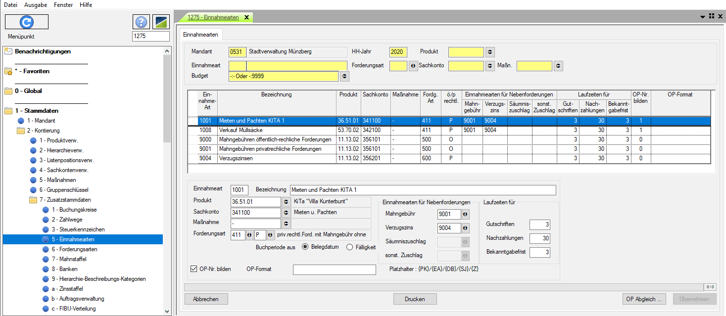 Bei einer Vielzahl bereits angelegter Einnahmearten kann die Anzeige über die Selektionsfelder oberhalb der Aufstellung gezielt eingegrenzt werden. Zur Neuerfassung einer Einnahmeart ist nach Eingabe von Mandant und Haushaltsjahr eine neue Zeile im Übersichtsfenster durch Betätigung der Einfg-Taste anzulegen. In der unteren Eingabemaske können nun alle Eingaben der neuen Einnahmeart erfasst und mit dem Button „Übernehmen“ abgespeichert werden. Dabei sind zunächst die Einnahmearten für Nebenforderungen (Mahngebühren, ...) unter Verwendung der zutreffenden anzulegen, damit diese dann bei der Anlage der Haupteinnahmearten ausgewählt und zugeordnet werden können. Änderungen einer bereits bestehenden Einnahmeart sind nach ihrer Markierung auf die gleiche Art und Weise vorzunehmen.