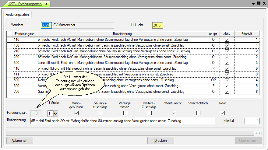 Die Forderungsarten werden als ein wesentlicher Bestandteil der Einnahmearten bei deren Klassifizierung benötigt und getrennt für die Forderungsbereiche privat- und öffentlich-rechtlich sowie für Nebenforderungen angelegt.