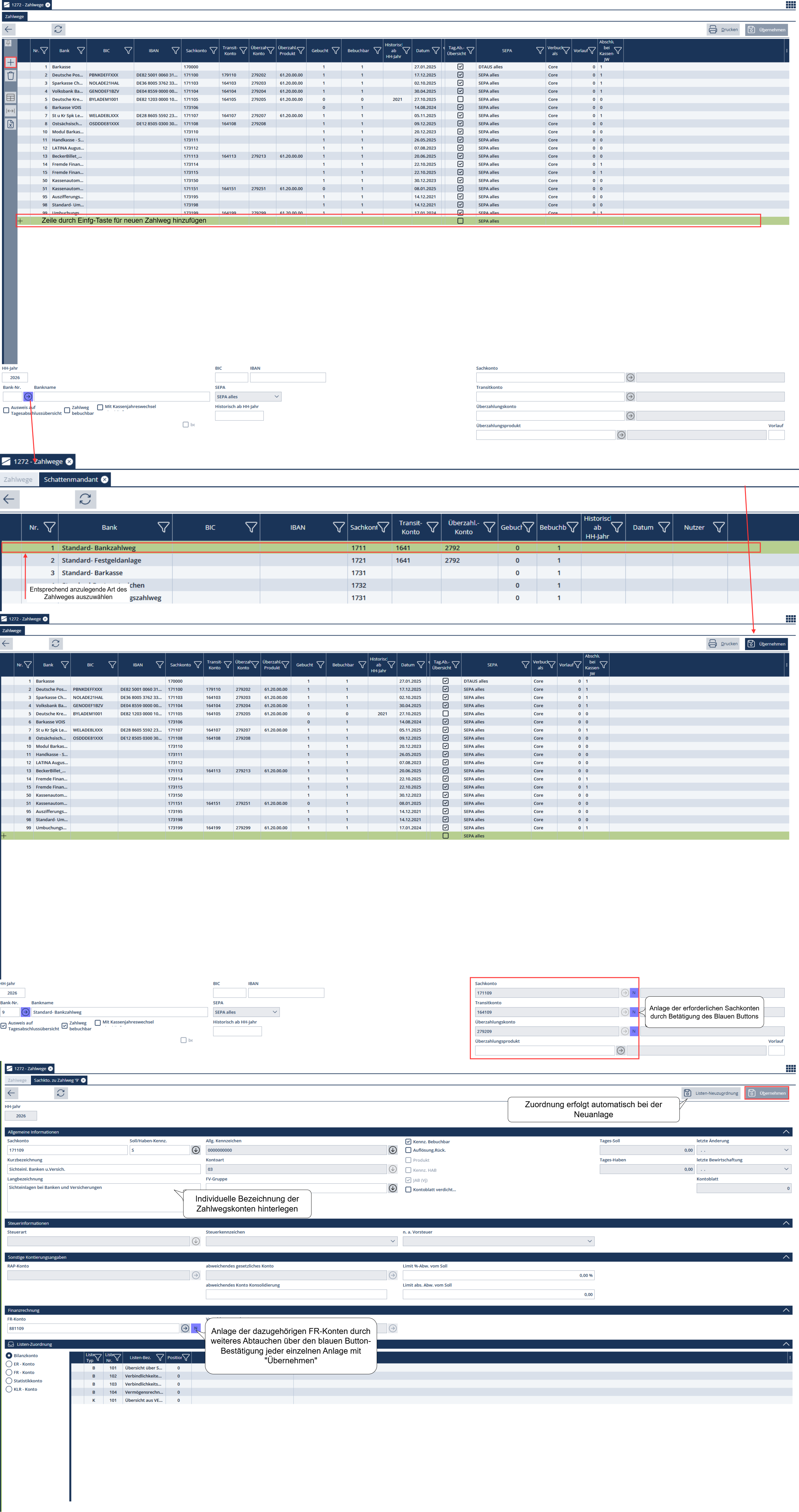 Zur Neuerfassung eines Zahlweges ist zunächst eine neue Zeile in der Übersichtstabelle durch Betätigung der Einfg-Taste anzulegen. Die Zahlwegsangaben selbst werden danach über die unteren Eingabefelder erfasst. Dazu sind folgende Varianten möglich: