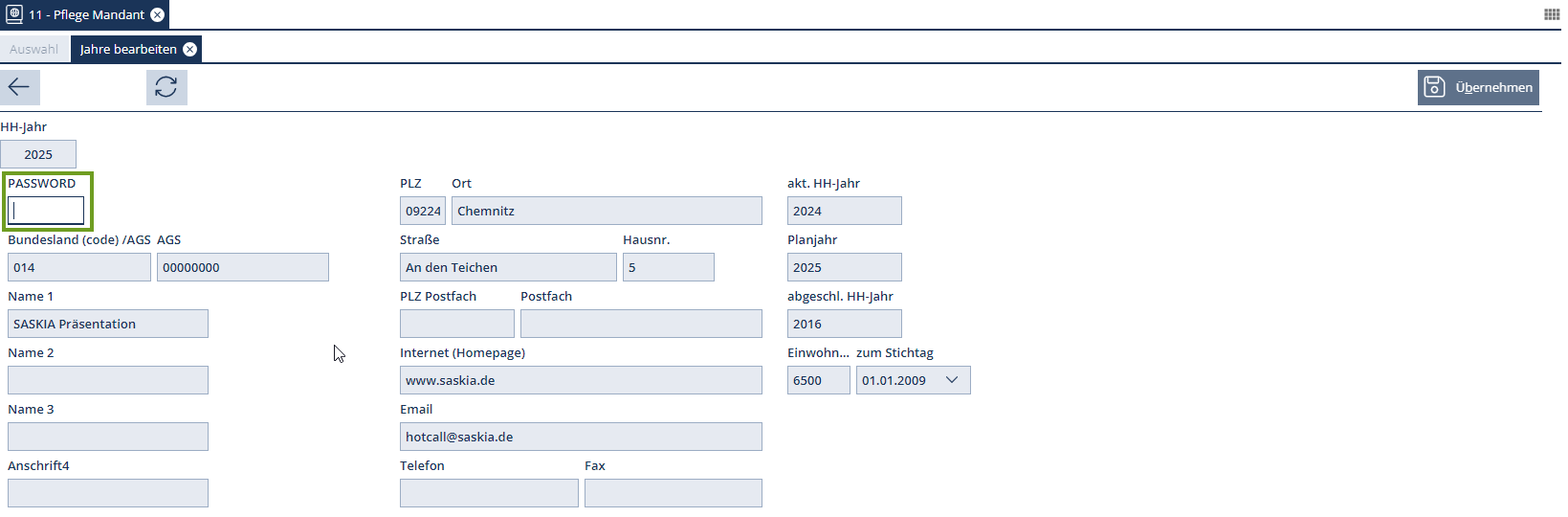 Es handelt sich hierbei um eine passwortgeschützte Funktion vor deren Anwendung unbedingt die Rücksprache mit dem -Support durchzuführen ist. Nach Eingabe des Tagespasswortes sind Änderungen in den Feldern „akt. HH-Jahr“, „abgeschl. HH-Jahr“ und „Planjahr“ möglich.