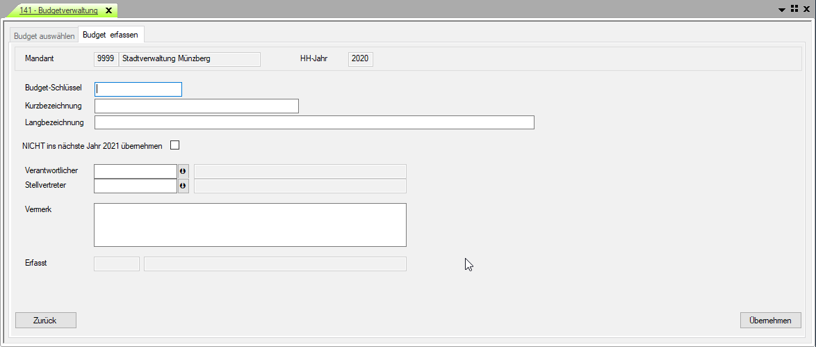 Zurück Rückkehr in das Auswahlfenster der Budgetverwaltung, nicht gespeicherte Änderungen werden verworfen Übernehmen Speicherung der erfassten Eingaben, das Budget wird angelegt