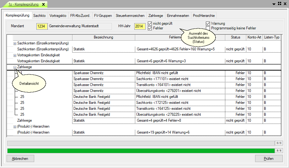 Die Durchführung der Komplexprüfung (1. Registerkarte) beinhaltet bereits alle nachfolgenden Teilprüfungen und ist bei großen Datenbeständen unter Umständen sehr zeitintensiv.